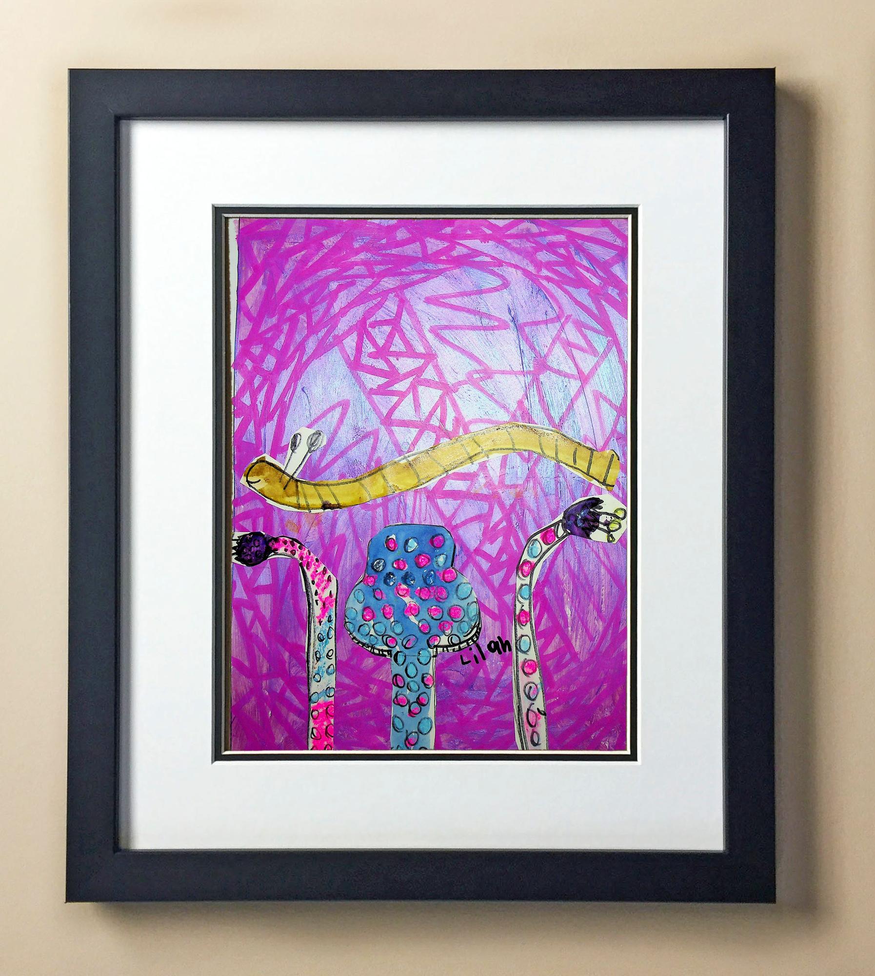 Included with the purchase is the Students Artwork, Frame, double matboard, shatter proof plexiglass, and a ready to hang backerboard with turnbuttons