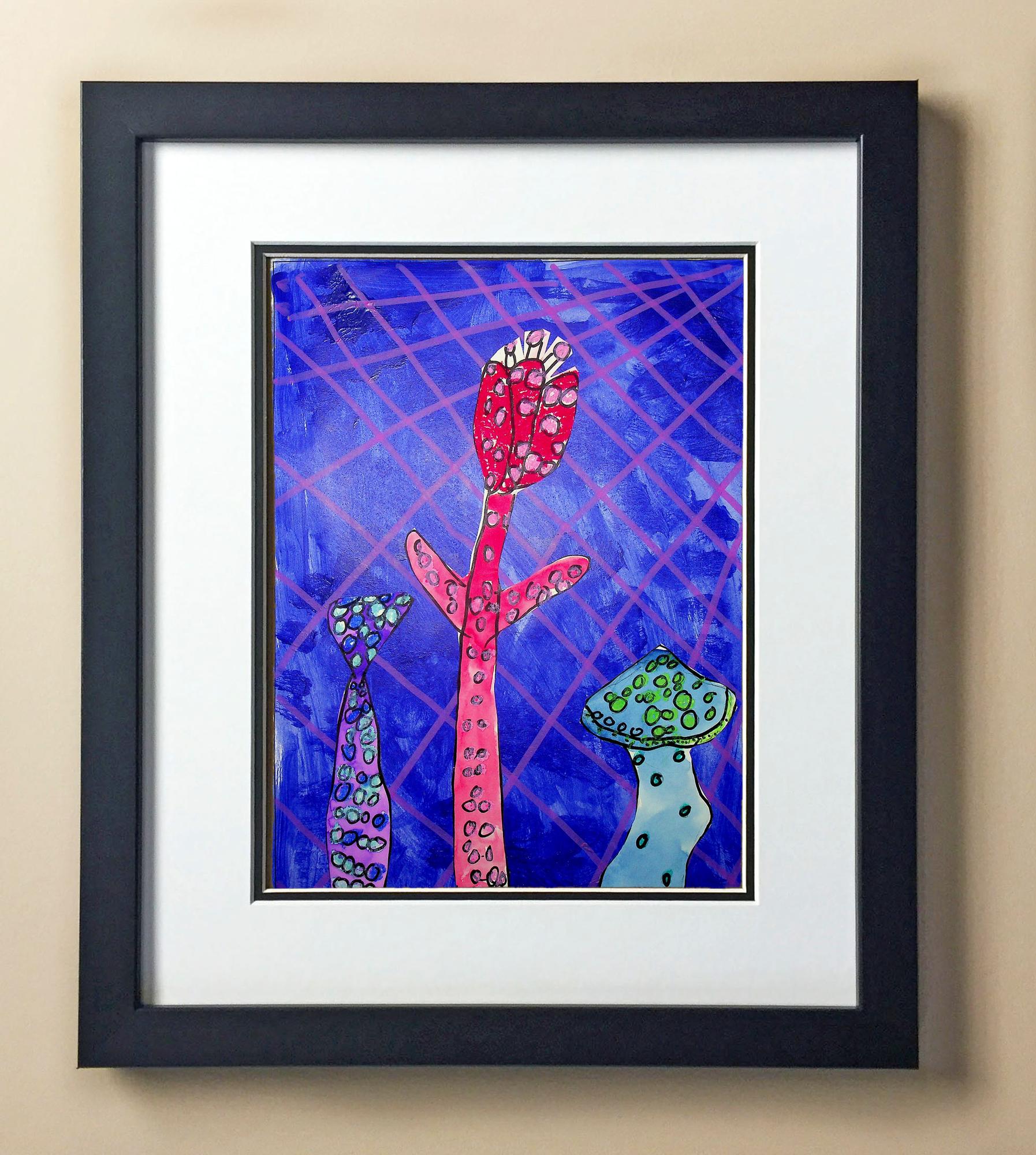 Included with the purchase is the Students Artwork, Frame, double matboard, shatter proof plexiglass, and a ready to hang backerboard with turnbuttons