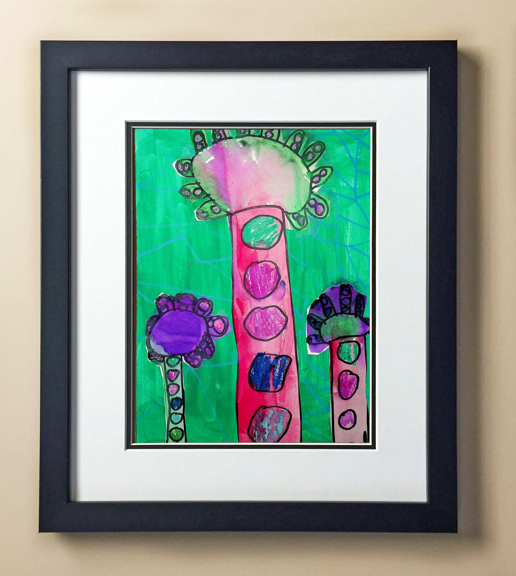 Included with the purchase is the Students Artwork, Frame, double matboard, shatter proof plexiglass, and a ready to hang backerboard with turnbuttons