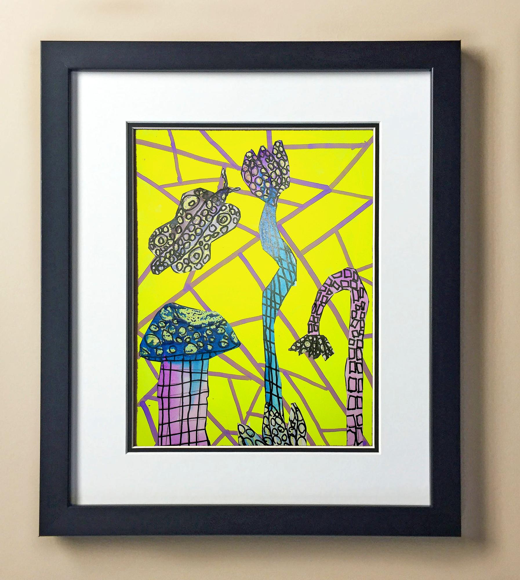 Included with the purchase is the Students Artwork, Frame, double matboard, shatter proof plexiglass, and a ready to hang backerboard with turnbuttons