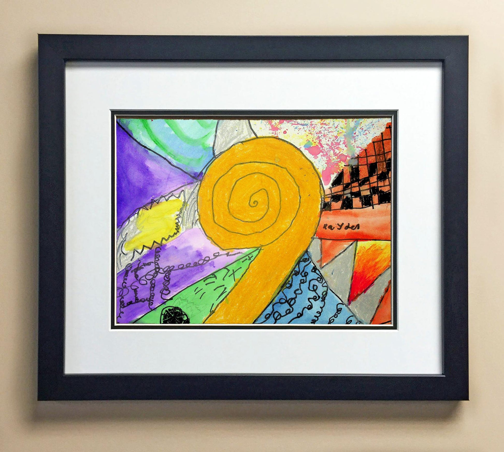 Included with the purchase is the Students Artwork, Frame, double matboard, shatter proof plexiglass, and a ready to hang backerboard with turnbuttons