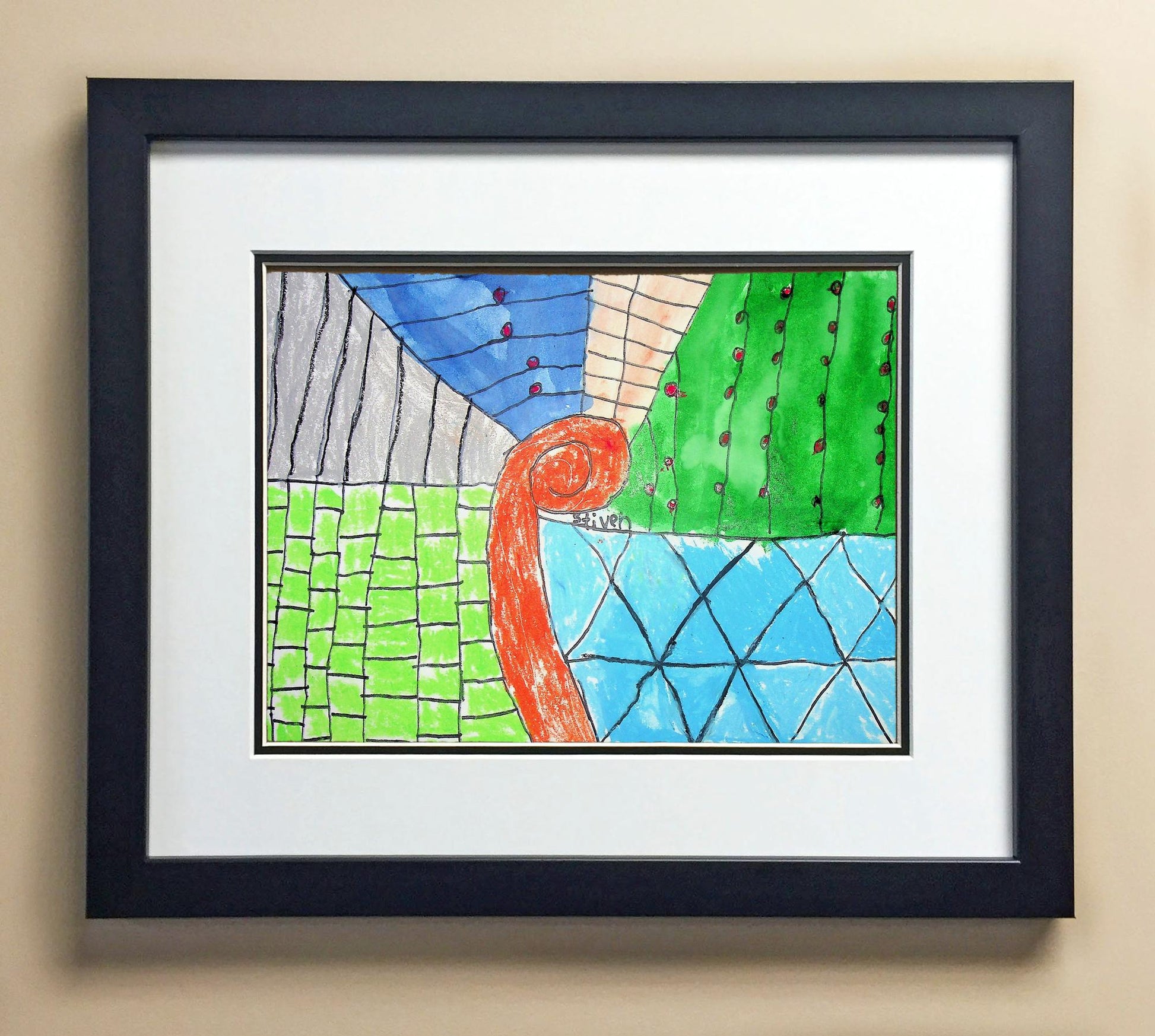 Included with the purchase is the Students Artwork, Frame, double matboard, shatter proof plexiglass, and a ready to hang backerboard with turnbuttons