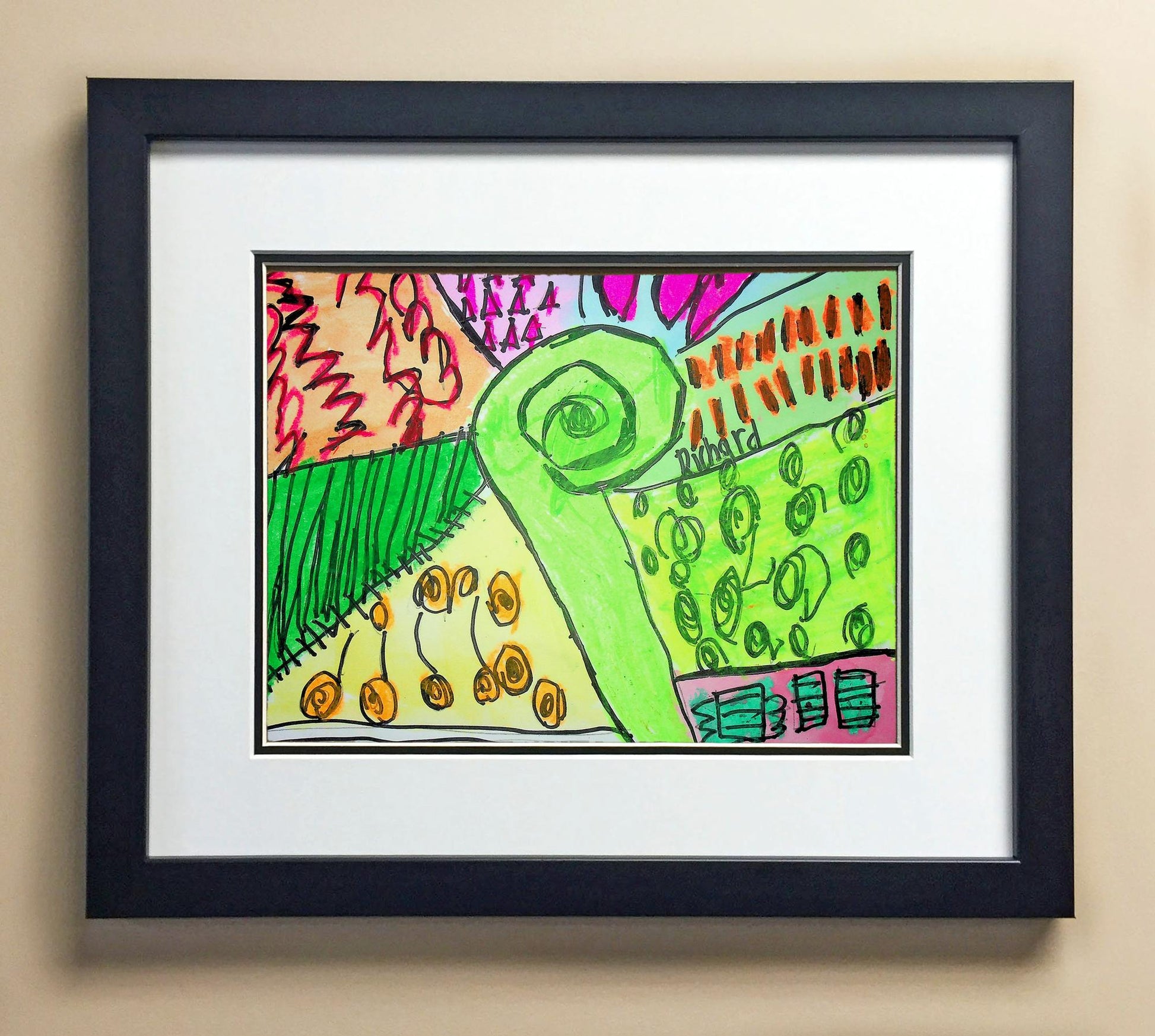 Included with the purchase is the Students Artwork, Frame, double matboard, shatter proof plexiglass, and a ready to hang backerboard with turnbuttons