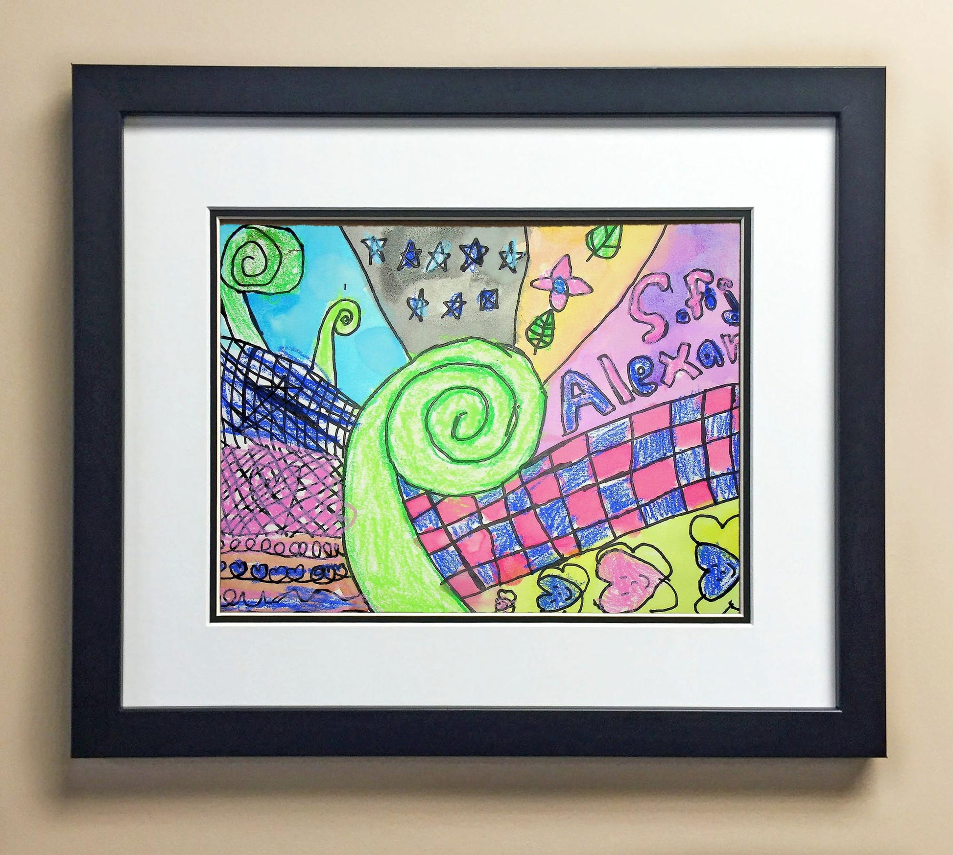 Included with the purchase is the Students Artwork, Frame, double matboard, shatter proof plexiglass, and a ready to hang backerboard with turnbuttons