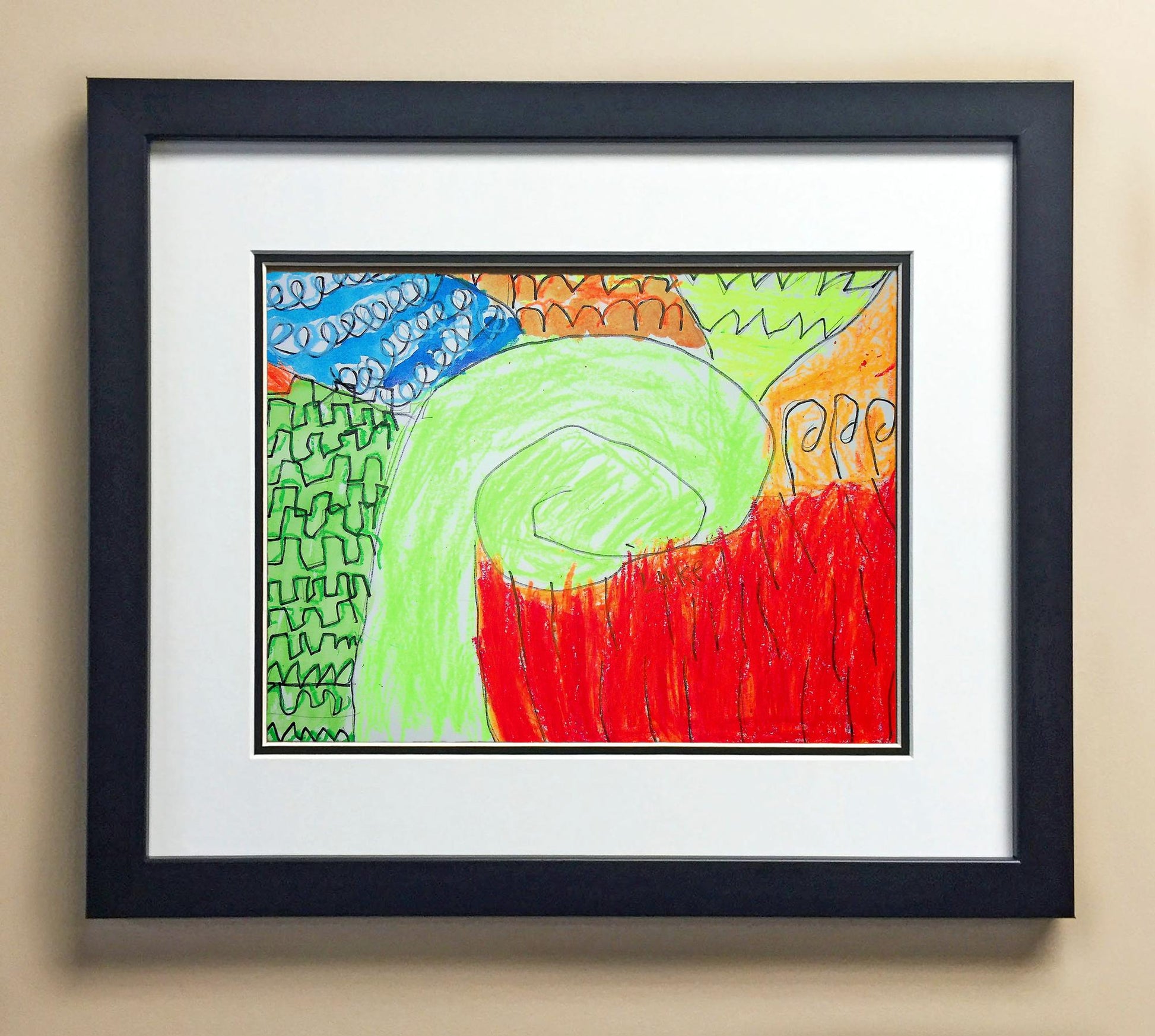 Included with the purchase is the Students Artwork, Frame, double matboard, shatter proof plexiglass, and a ready to hang backerboard with turnbuttons