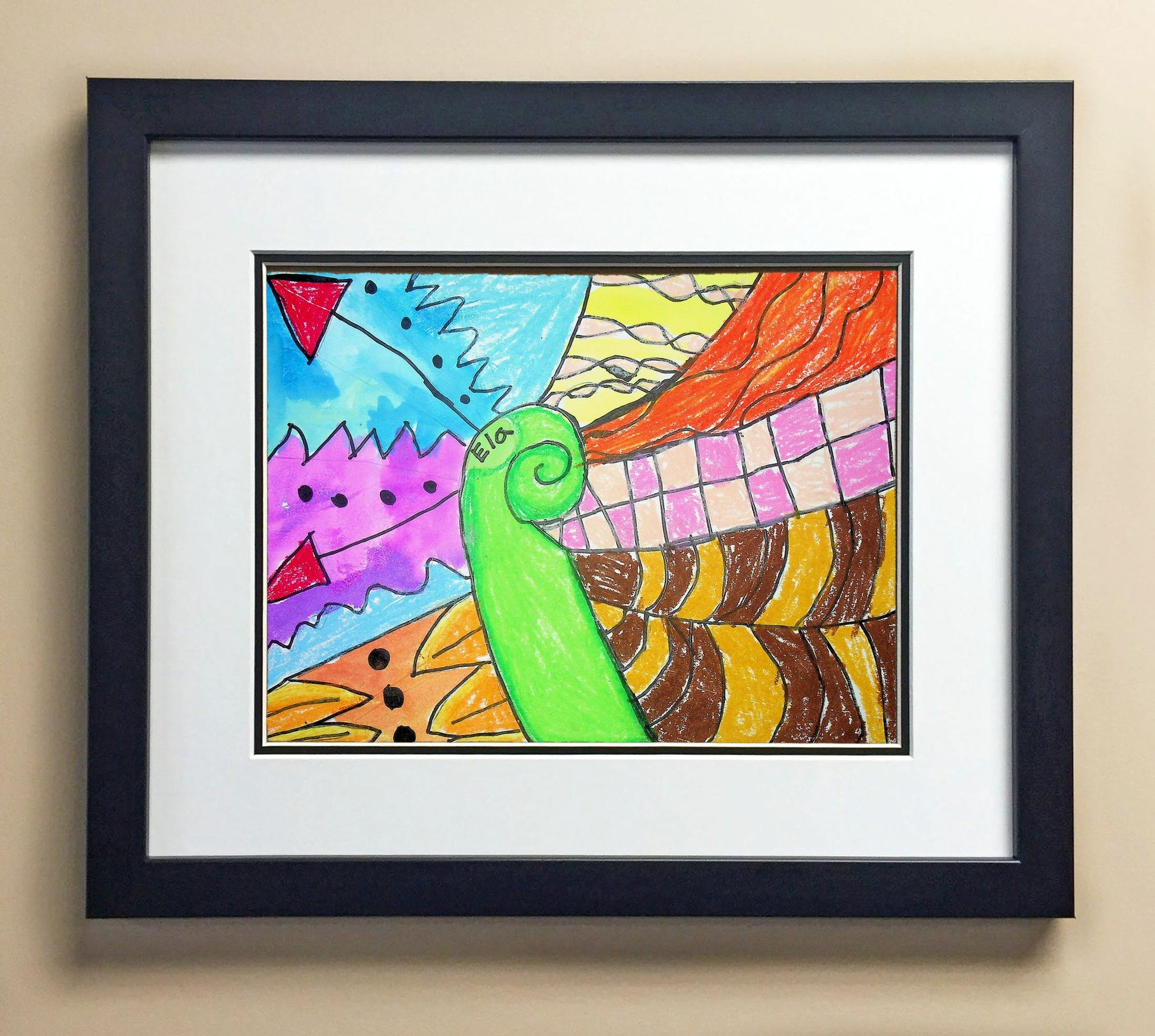 Included with the purchase is the Students Artwork, Frame, double matboard, shatter proof plexiglass, and a ready to hang backerboard with turnbuttons