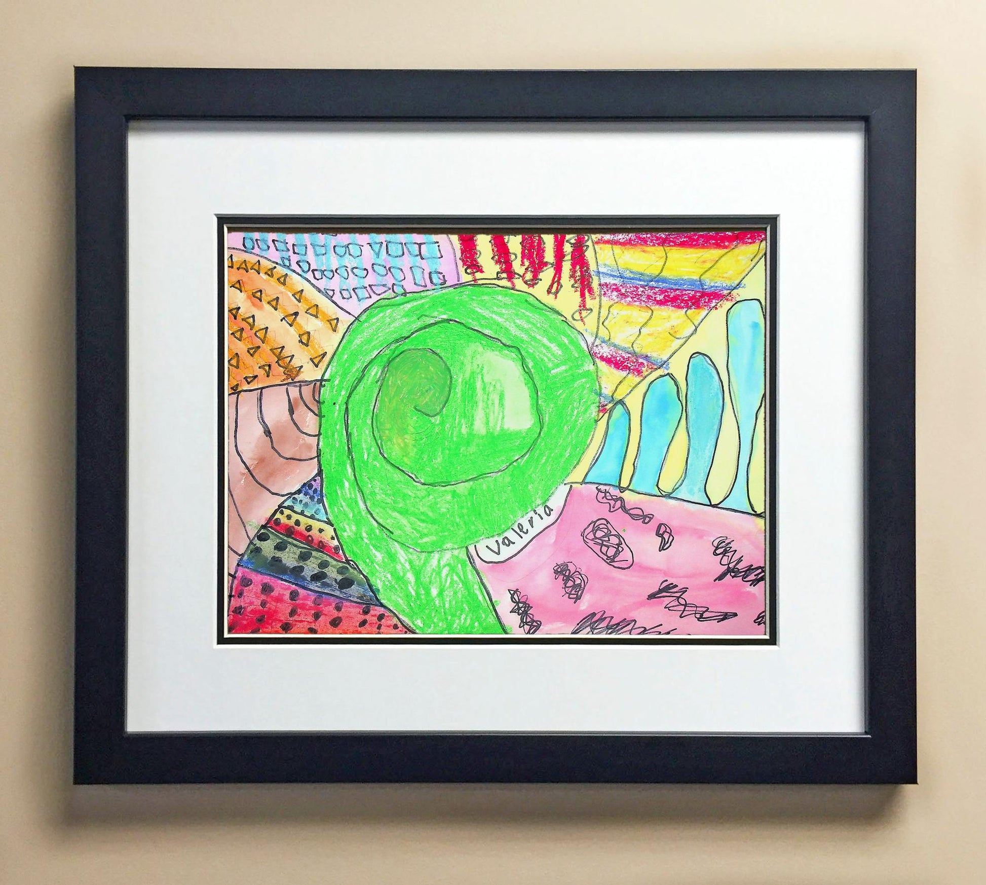 Included with the purchase is the Students Artwork, Frame, double matboard, shatter proof plexiglass, and a ready to hang backerboard with turnbuttons