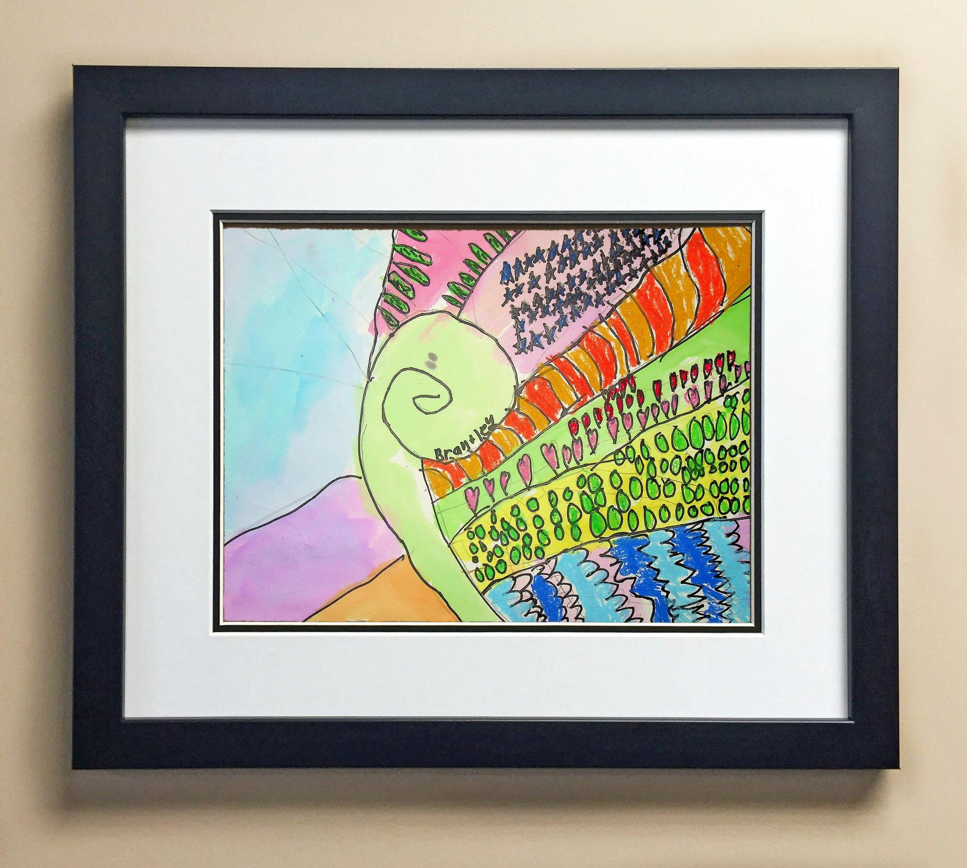 Included with the purchase is the Students Artwork, Frame, double matboard, shatter proof plexiglass, and a ready to hang backerboard with turnbuttons