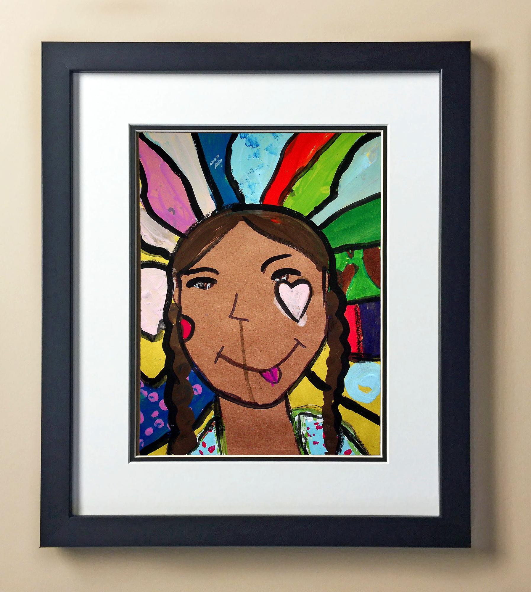 Included with the purchase is the Students Artwork, Frame, double matboard, shatter proof plexiglass, and a ready to hang backerboard with turnbuttons