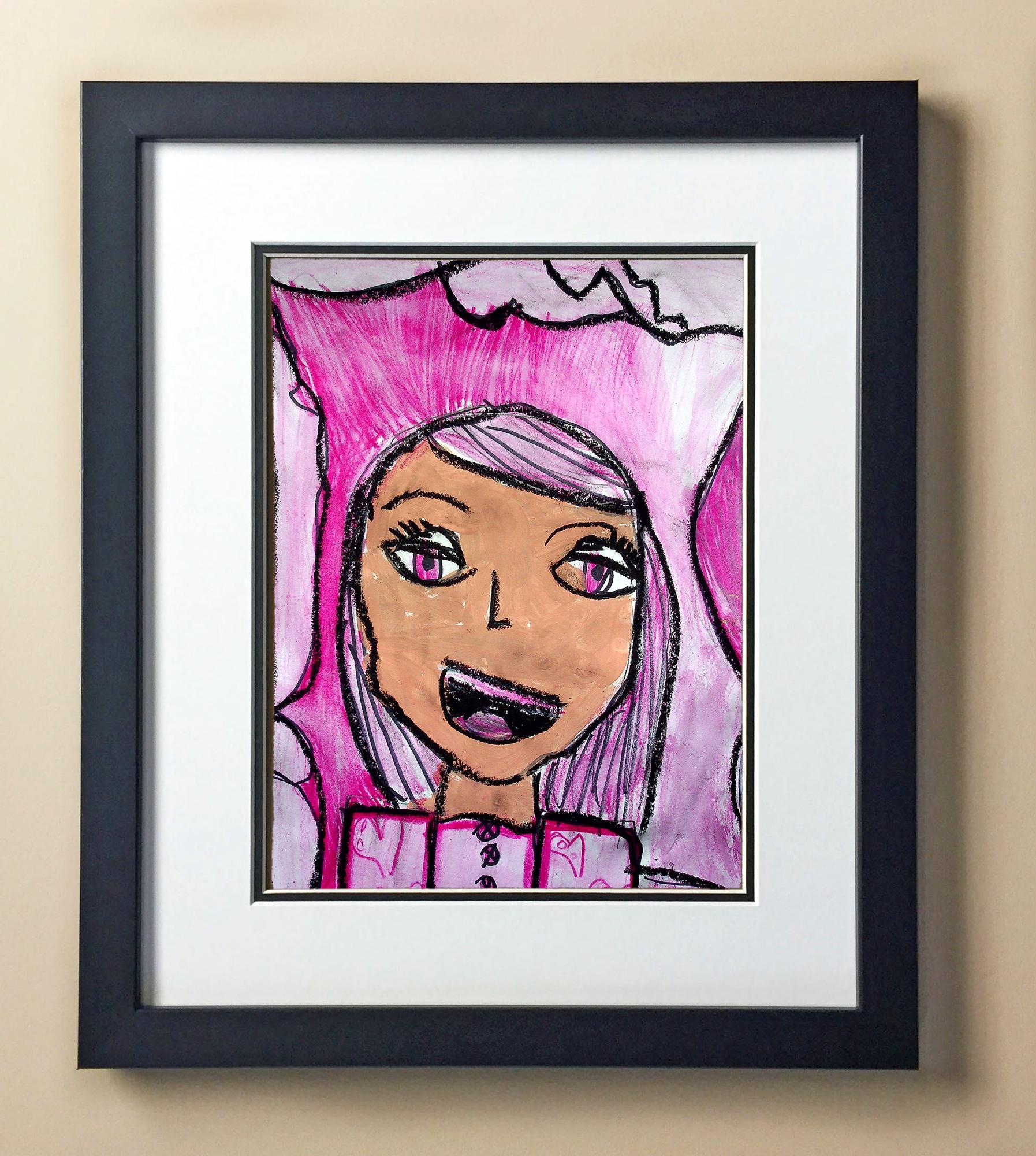 Included with the purchase is the Students Artwork, Frame, double matboard, shatter proof plexiglass, and a ready to hang backerboard with turnbuttons