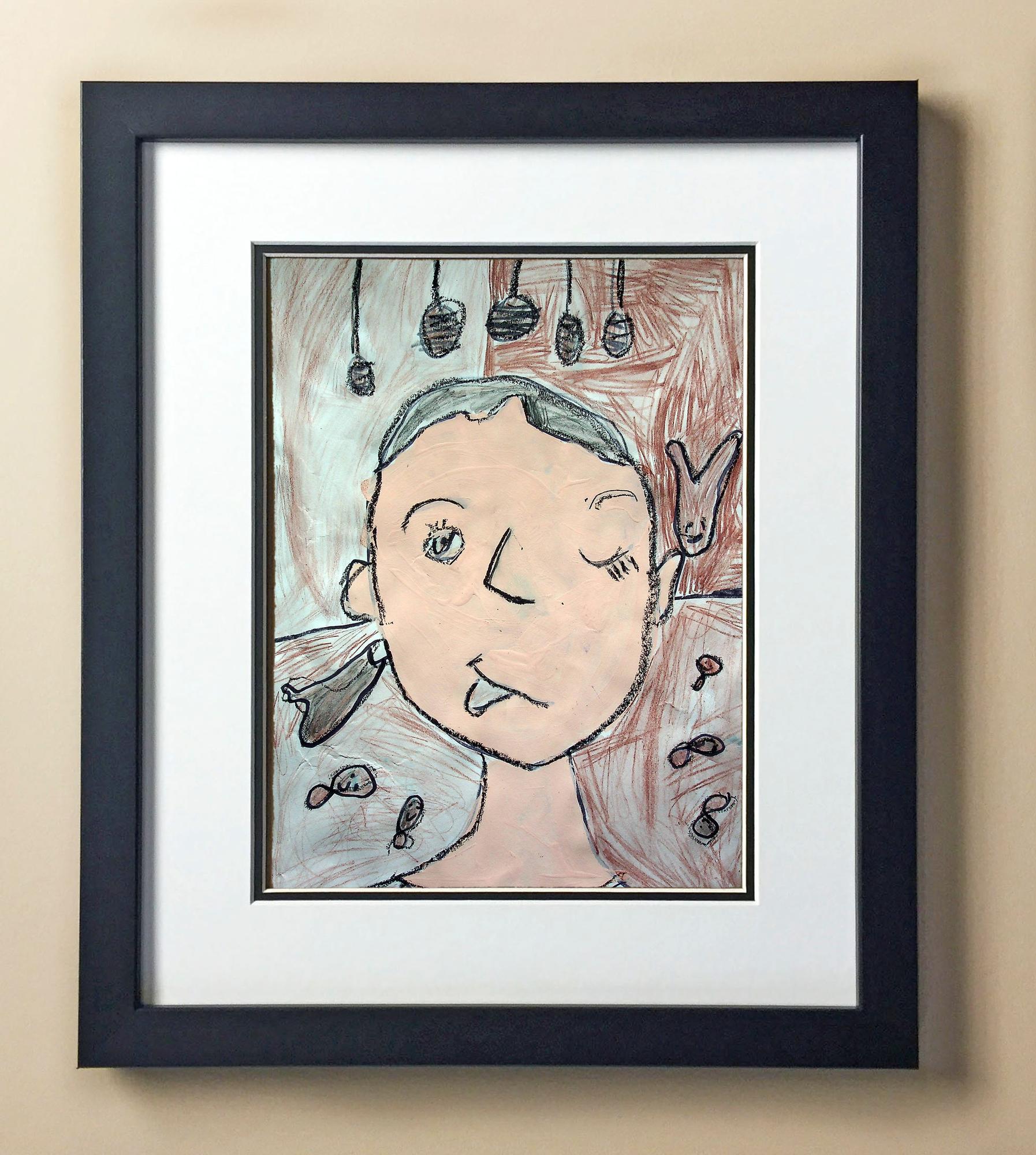 Included with the purchase is the Students Artwork, Frame, double matboard, shatter proof plexiglass, and a ready to hang backerboard with turnbuttons