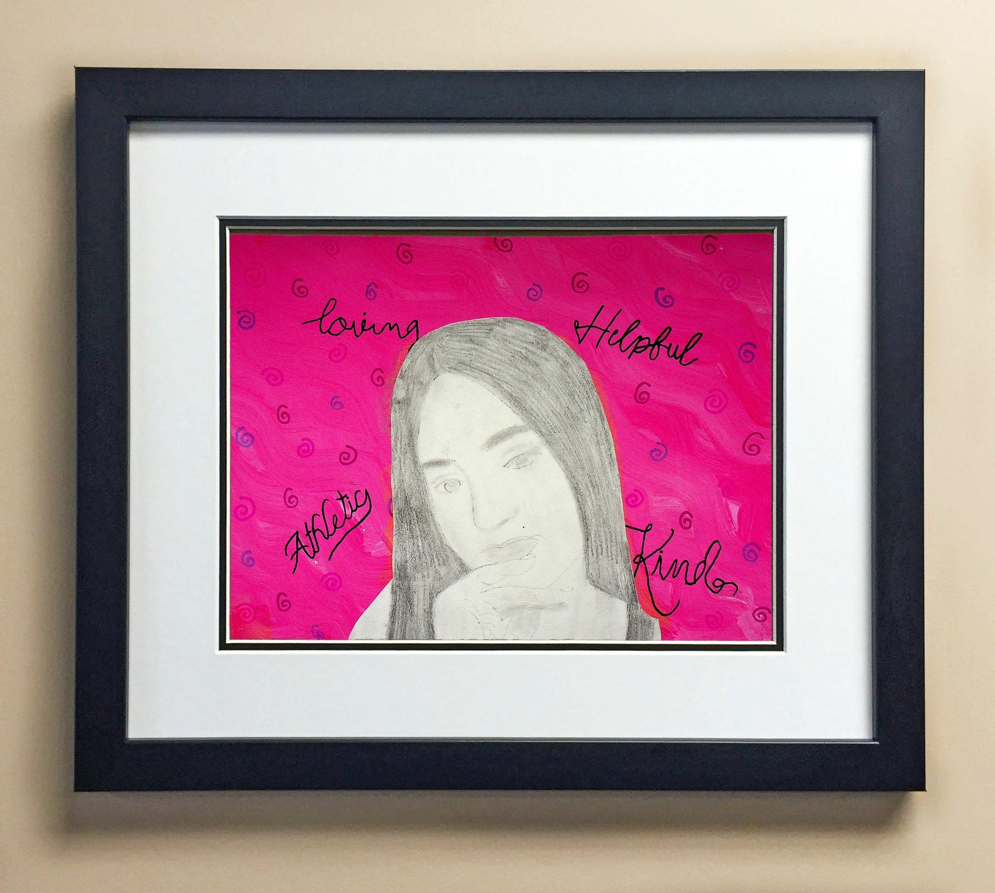 Included with the purchase is the Students Artwork, Frame, double matboard, shatter proof plexiglass, and a ready to hang backerboard with turnbuttons