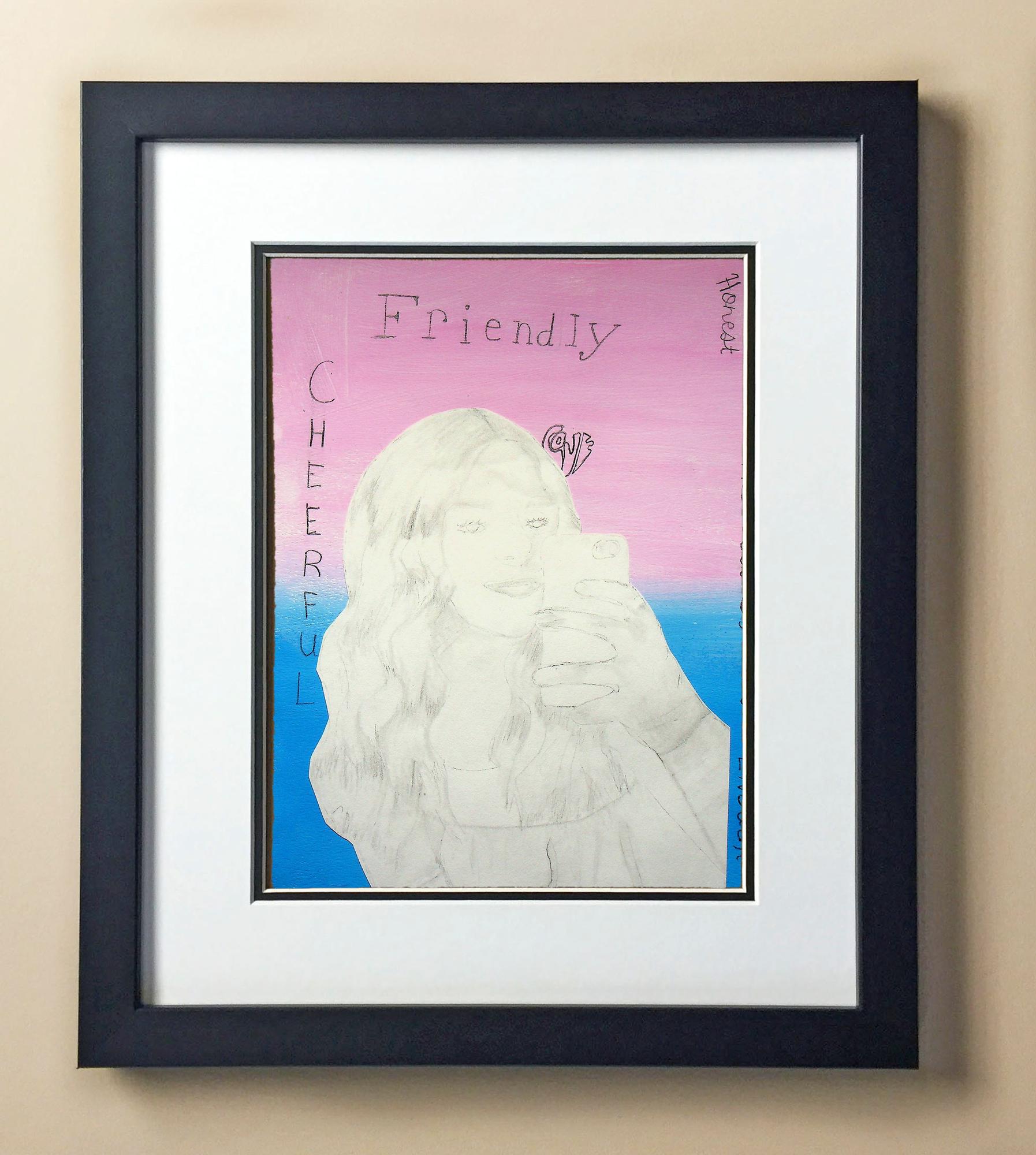 Included with the purchase is the Students Artwork, Frame, double matboard, shatter proof plexiglass, and a ready to hang backerboard with turnbuttons