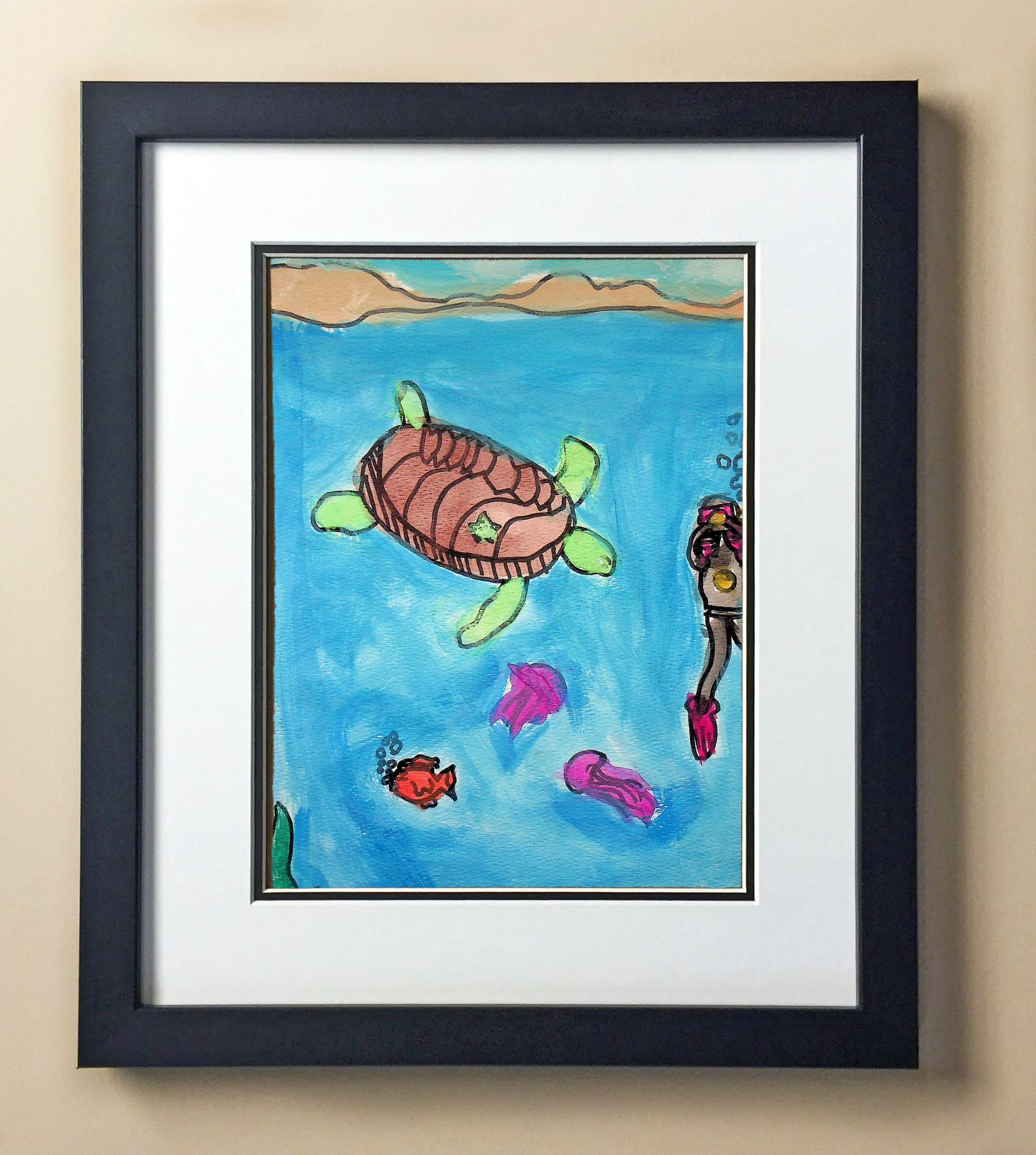 Included with the purchase is the Students Artwork, Frame, double matboard, shatter proof plexiglass, and a ready to hang backerboard with turnbuttons