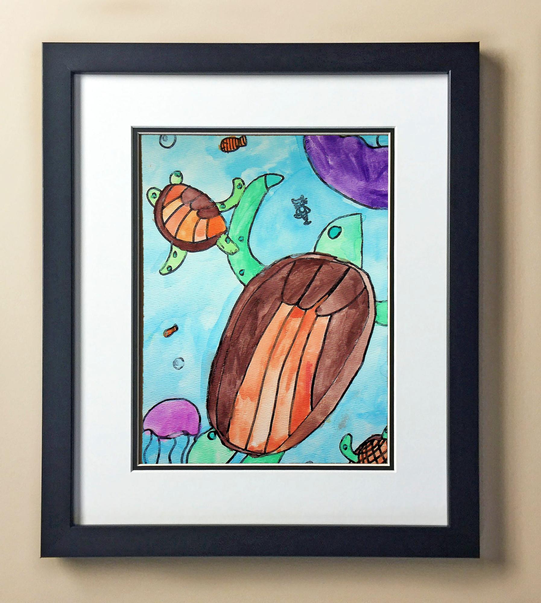 Included with the purchase is the Students Artwork, Frame, double matboard, shatter proof plexiglass, and a ready to hang backerboard with turnbuttons