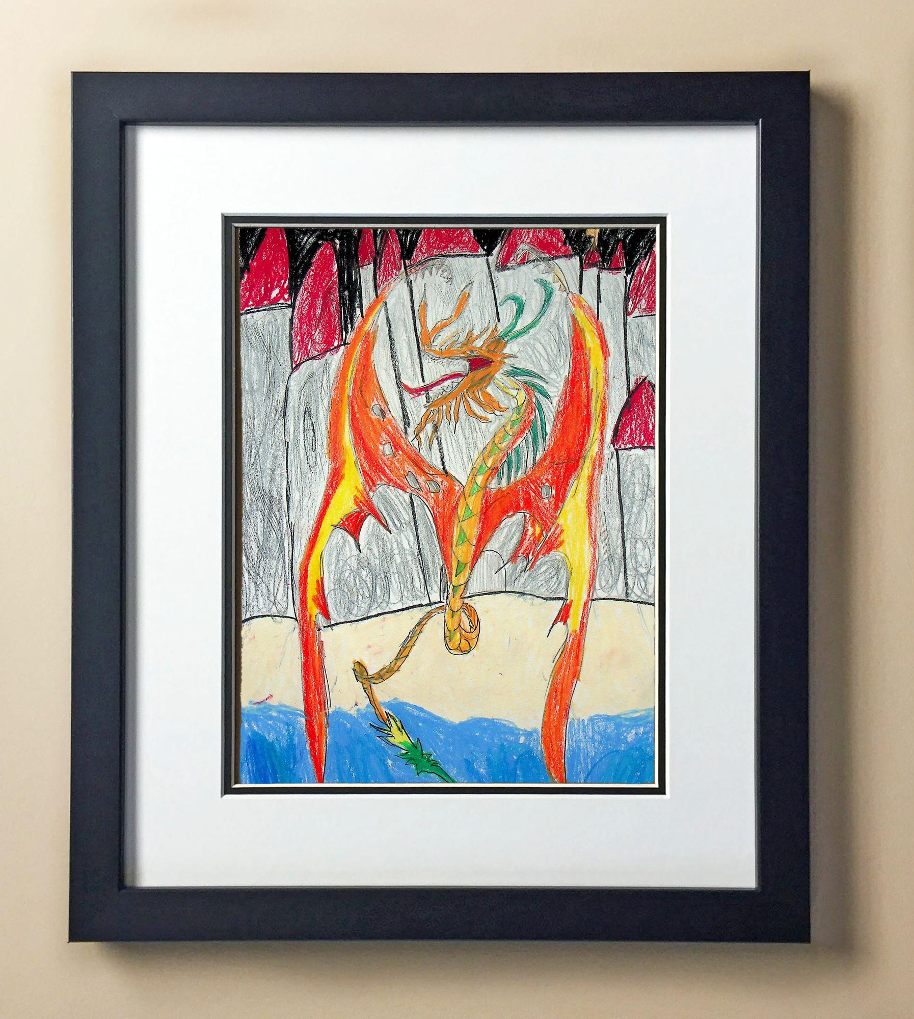 Included with the purchase is the Students Artwork, Frame, double matboard, shatter proof plexiglass, and a ready to hang backerboard with turnbuttons