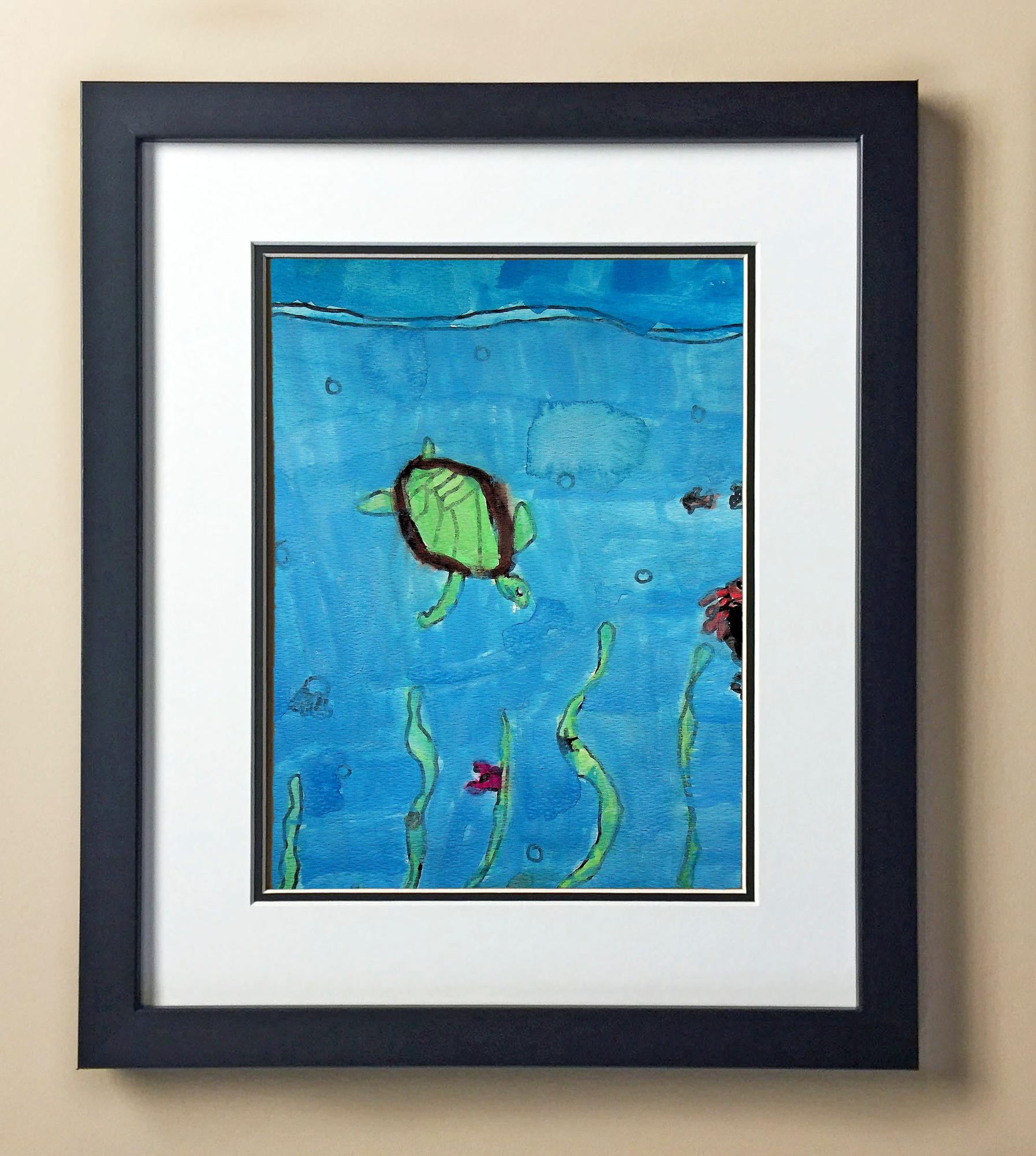 Included with the purchase is the Students Artwork, Frame, double matboard, shatter proof plexiglass, and a ready to hang backerboard with turnbuttons