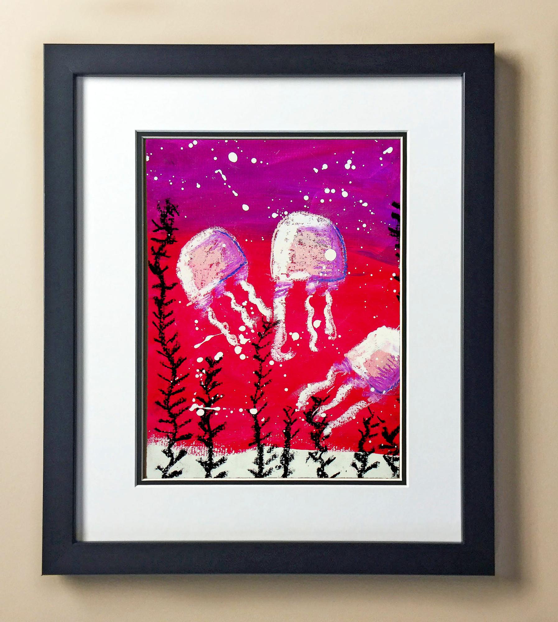Included with the purchase is the Students Artwork, Frame, double matboard, shatter proof plexiglass, and a ready to hang backerboard with turnbuttons