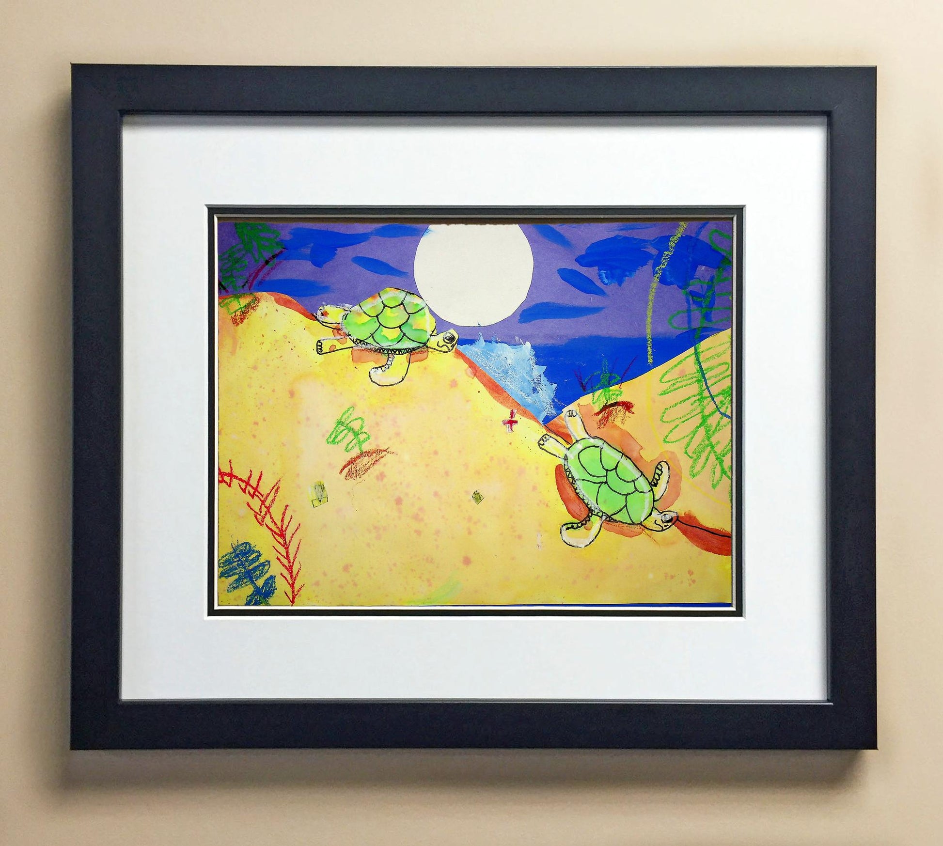 Included with the purchase is the Students Artwork, Frame, double matboard, shatter proof plexiglass, and a ready to hang backerboard with turnbuttons