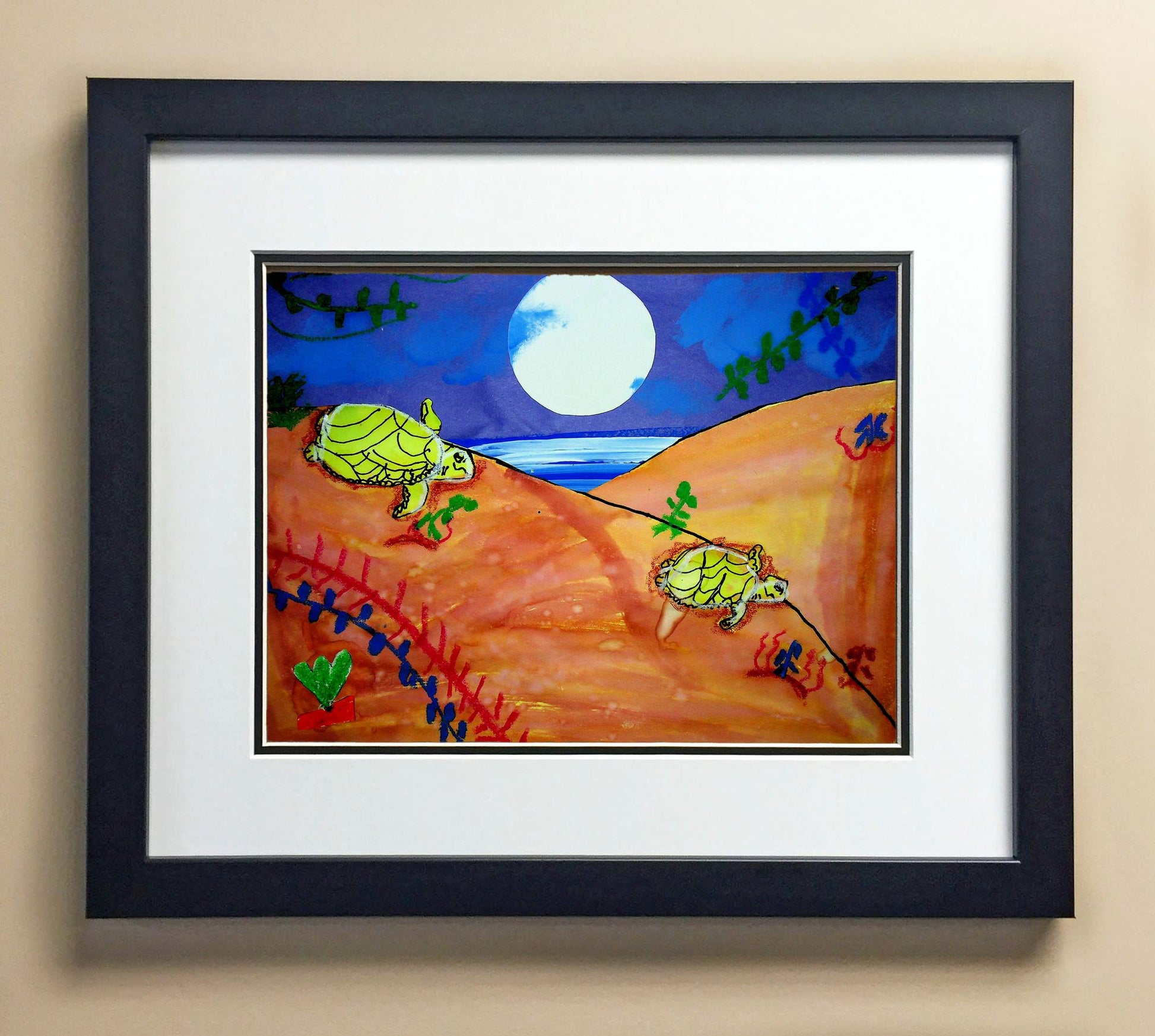 Included with the purchase is the Students Artwork, Frame, double matboard, shatter proof plexiglass, and a ready to hang backerboard with turnbuttons