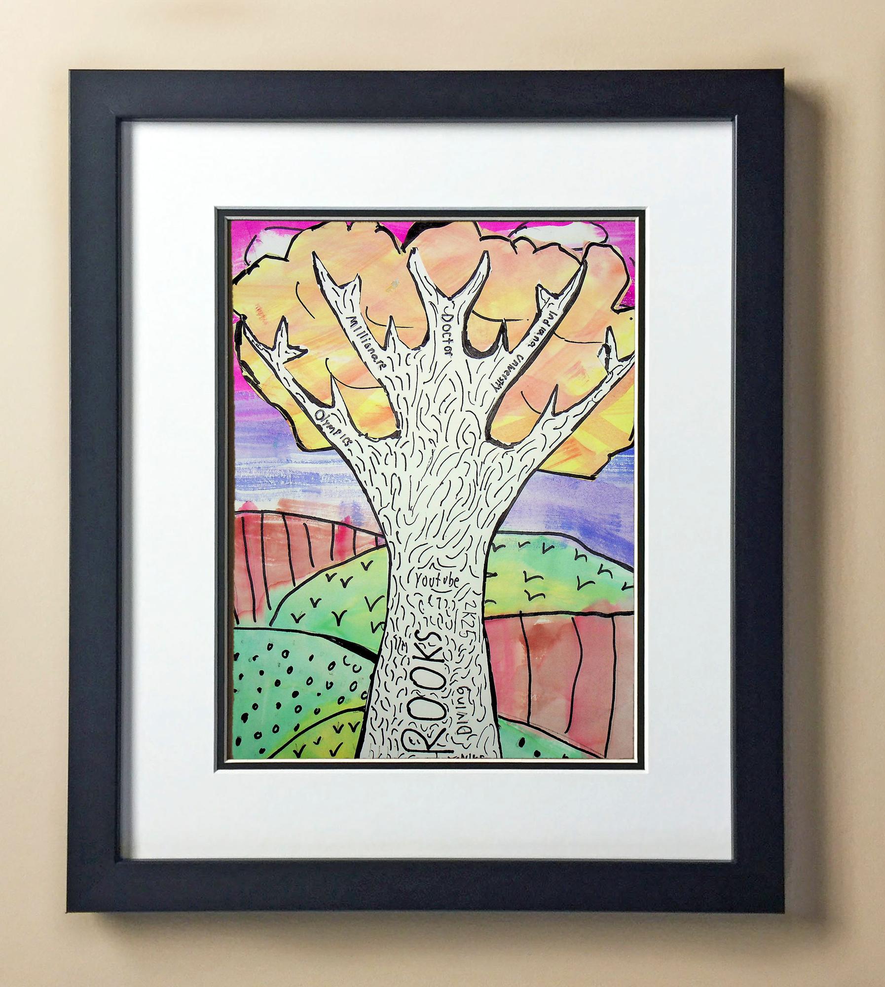 Included with the purchase is the Students Artwork, Frame, double matboard, shatter proof plexiglass, and a ready to hang backerboard with turnbuttons