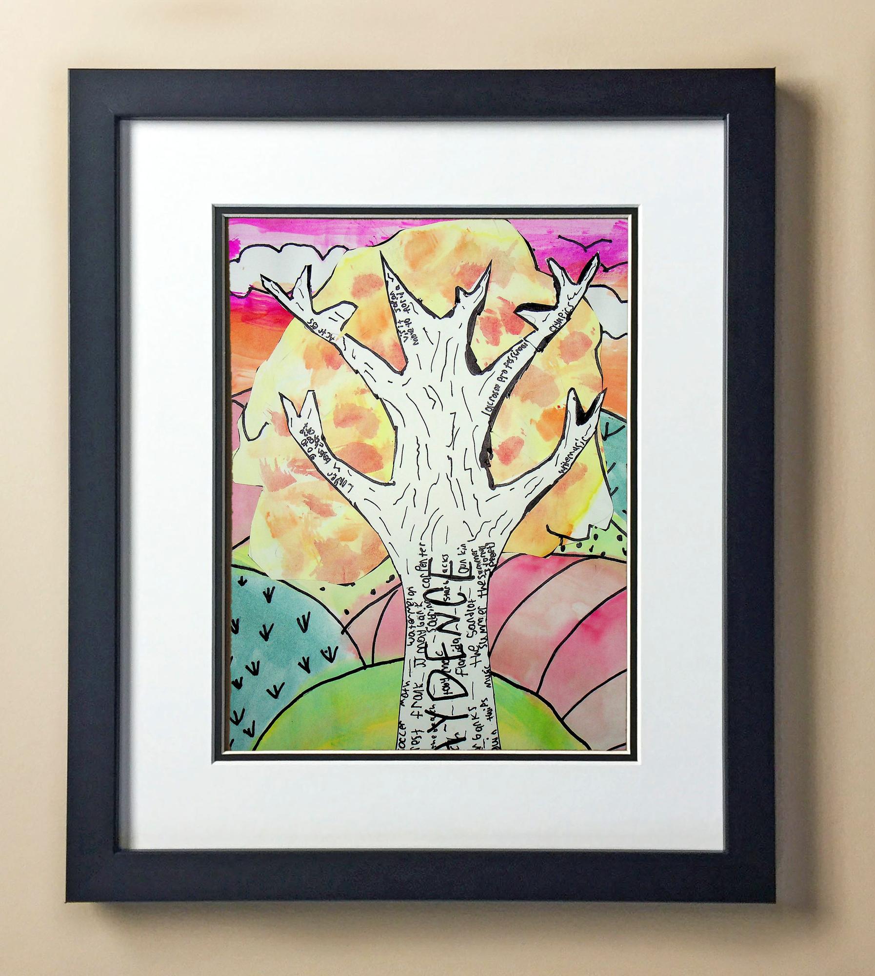 Included with the purchase is the Students Artwork, Frame, double matboard, shatter proof plexiglass, and a ready to hang backerboard with turnbuttons