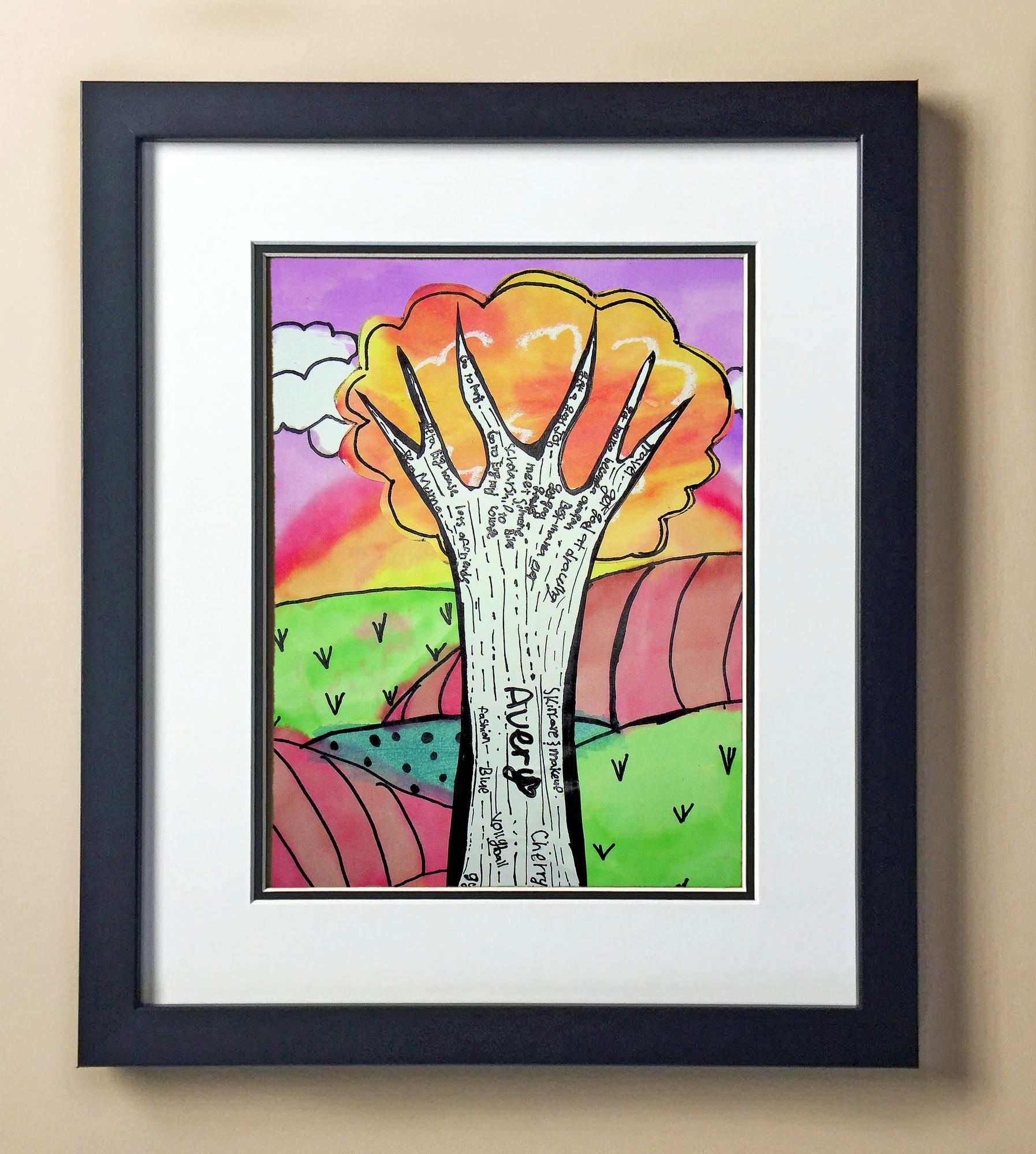 Included with the purchase is the Students Artwork, Frame, double matboard, shatter proof plexiglass, and a ready to hang backerboard with turnbuttons