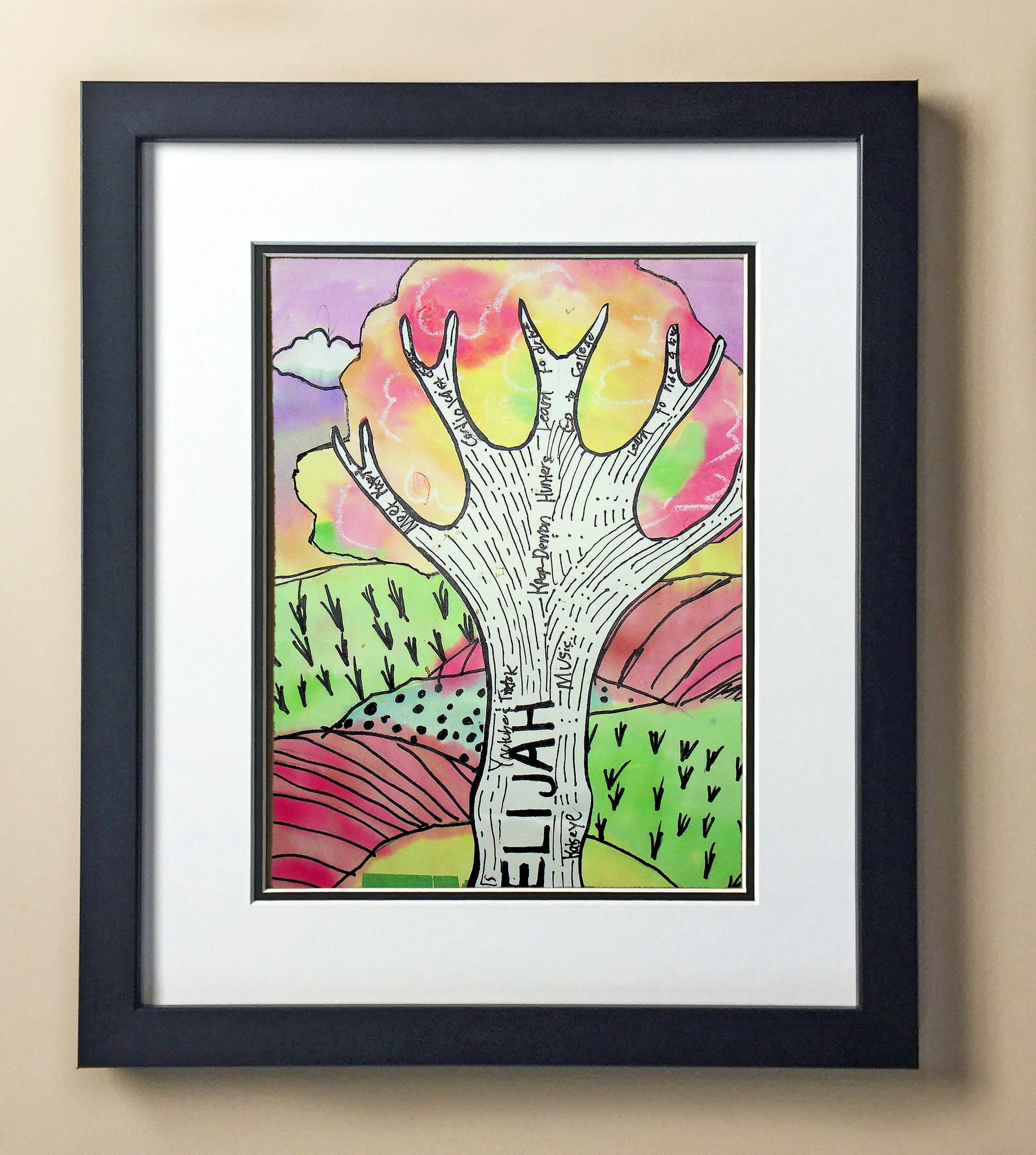 Included with the purchase is the Students Artwork, Frame, double matboard, shatter proof plexiglass, and a ready to hang backerboard with turnbuttons