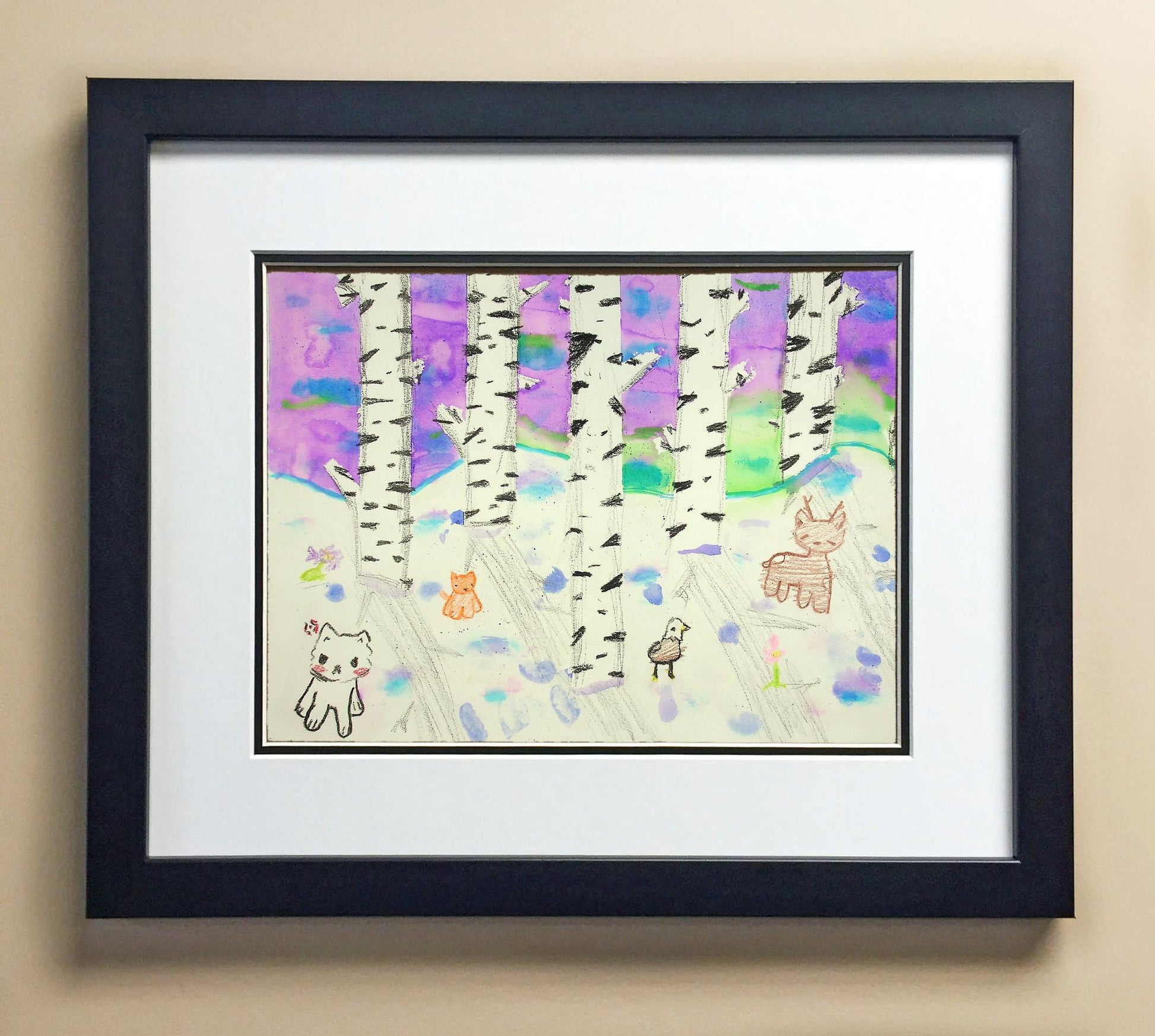 Included with the purchase is the Students Artwork, Frame, double matboard, shatter proof plexiglass, and a ready to hang backerboard with turnbuttons