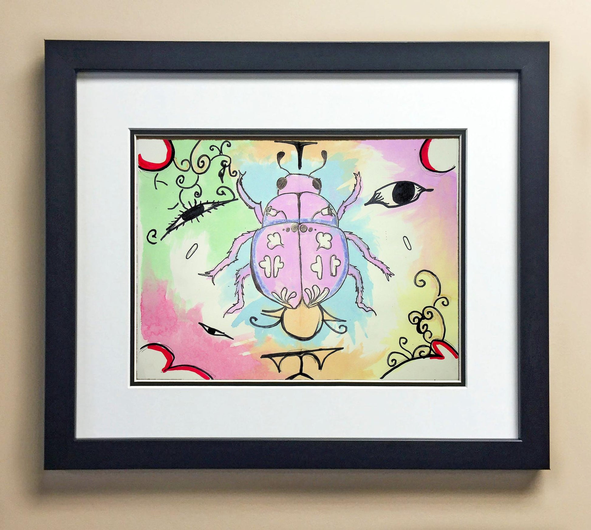 Included with the purchase is the Students Artwork, Frame, double matboard, shatter proof plexiglass, and a ready to hang backerboard with turnbuttons