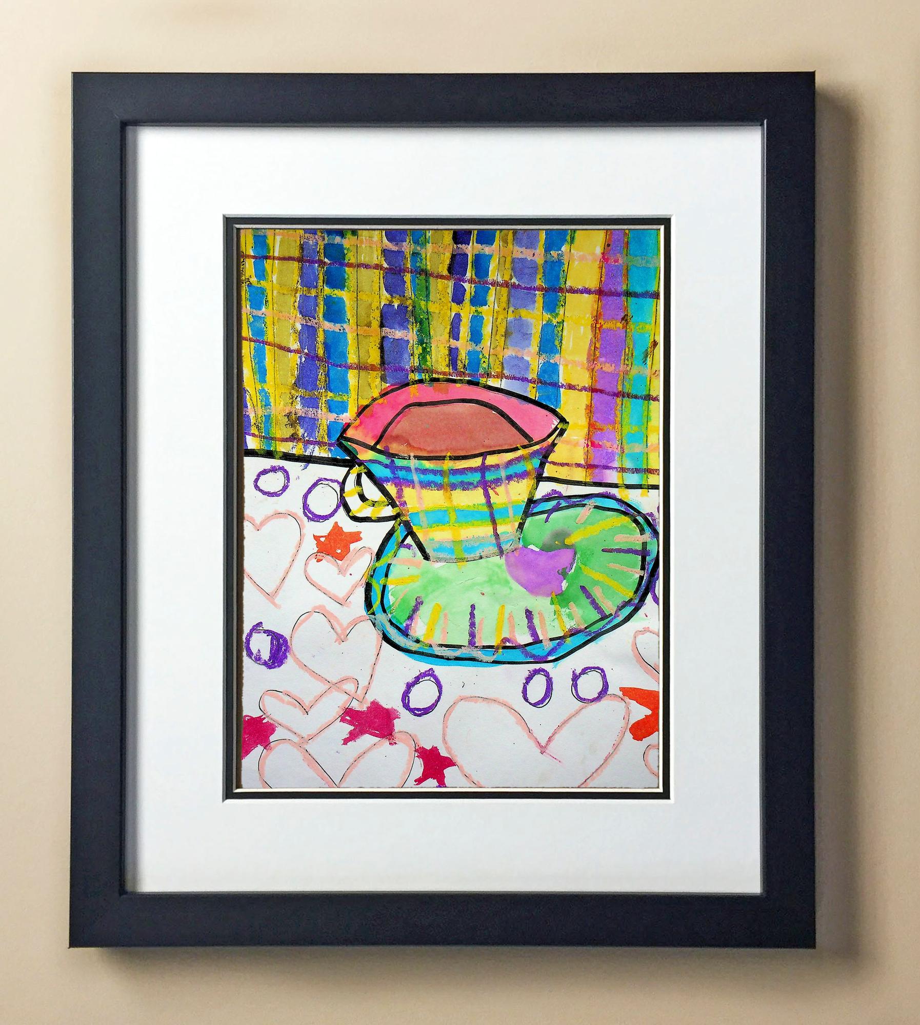 Included with the purchase is the Students Artwork, Frame, double matboard, shatter proof plexiglass, and a ready to hang backerboard with turnbuttons