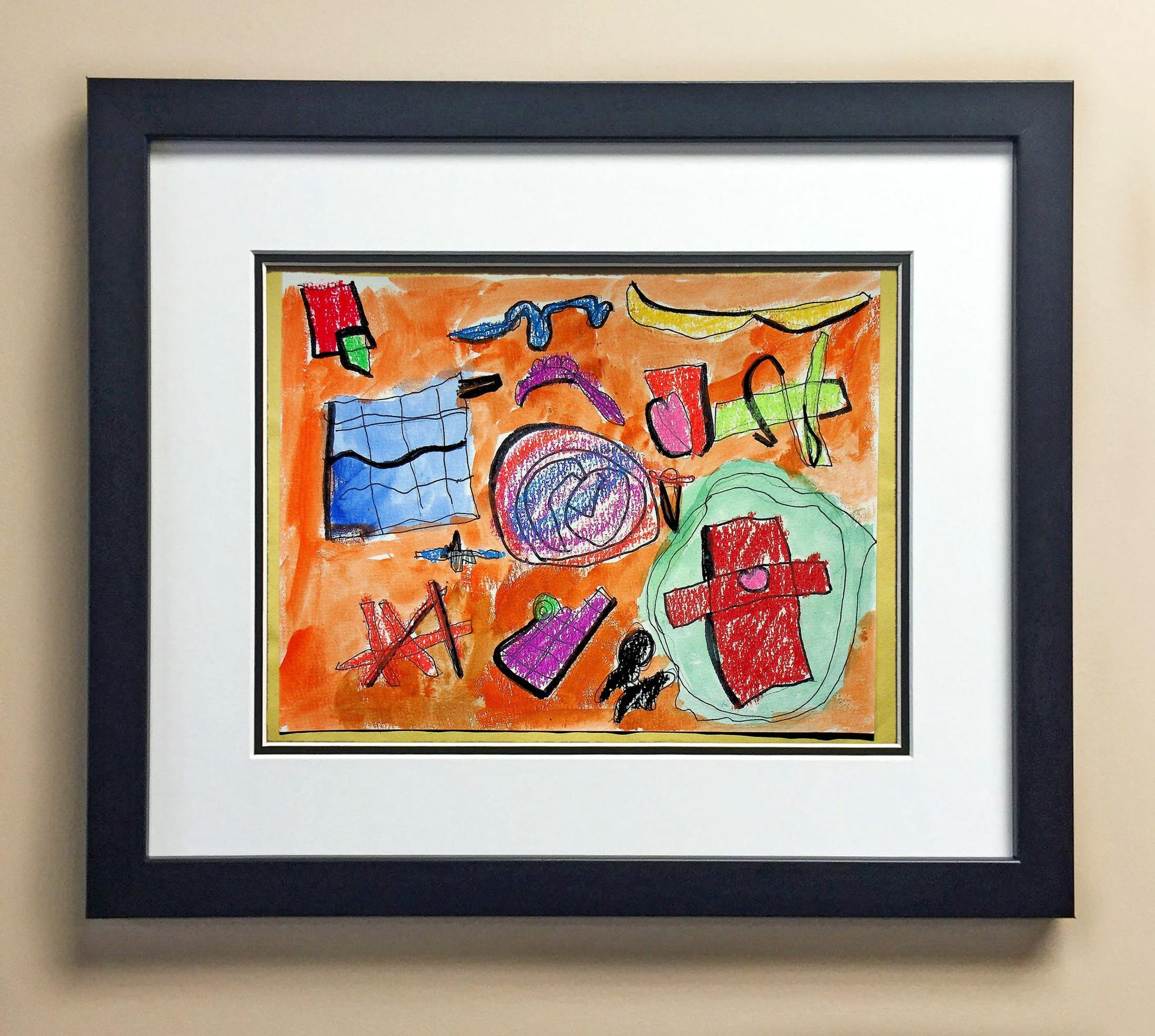 Included with the purchase is the Students Artwork, Frame, double matboard, shatter proof plexiglass, and a ready to hang backerboard with turnbuttons