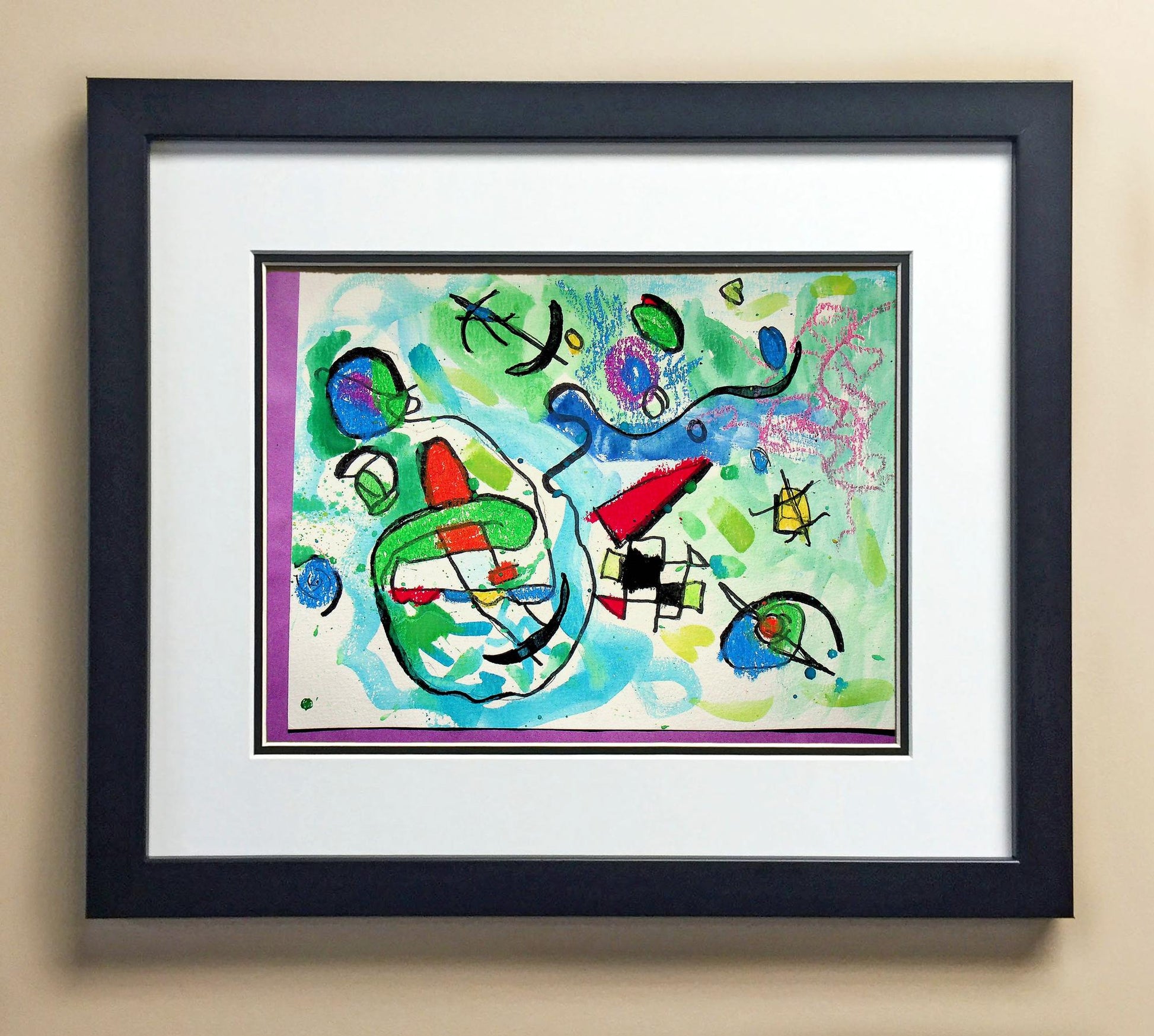 Included with the purchase is the Students Artwork, Frame, double matboard, shatter proof plexiglass, and a ready to hang backerboard with turnbuttons