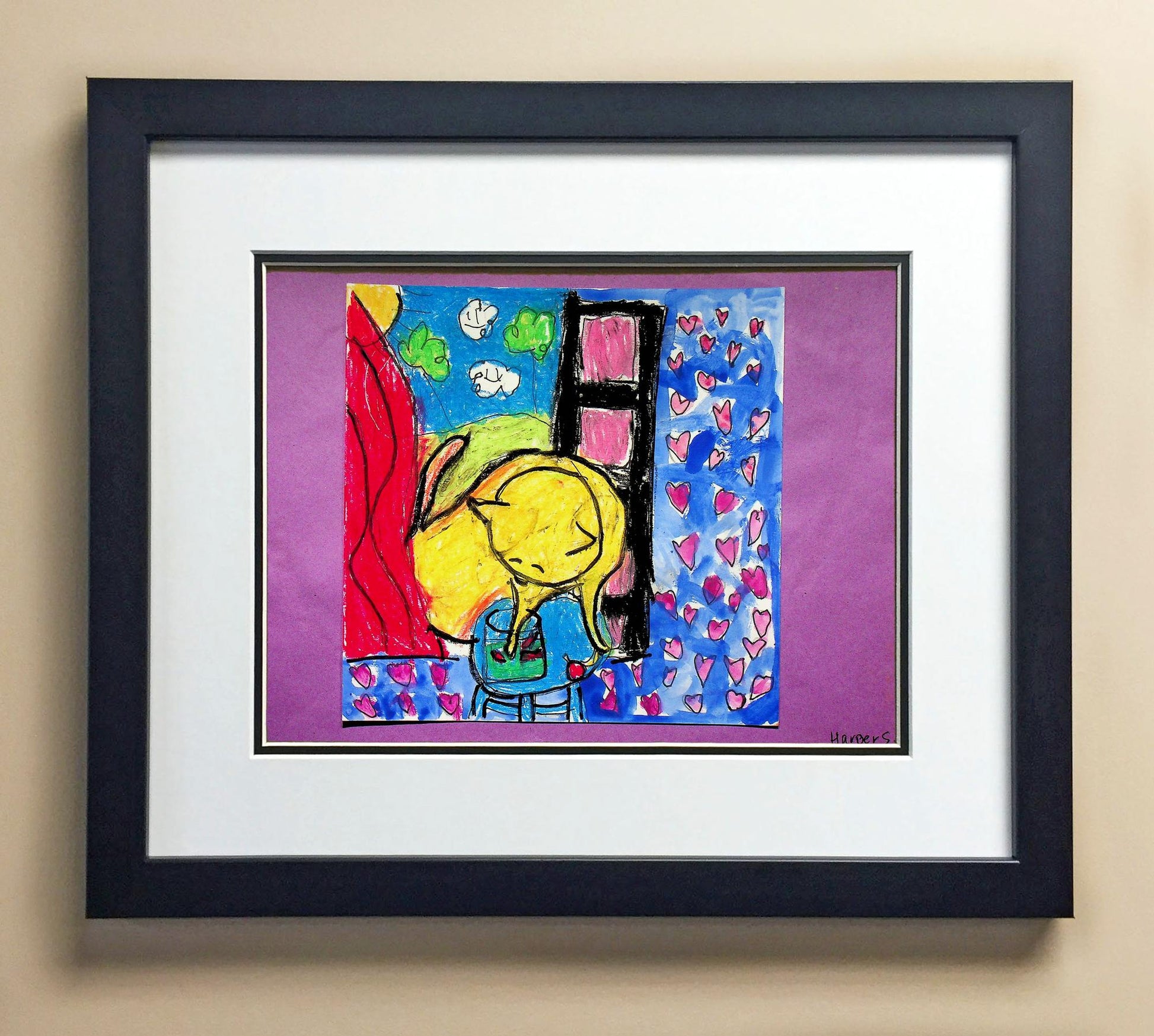 Included with the purchase is the Students Artwork, Frame, double matboard, shatter proof plexiglass, and a ready to hang backerboard with turnbuttons