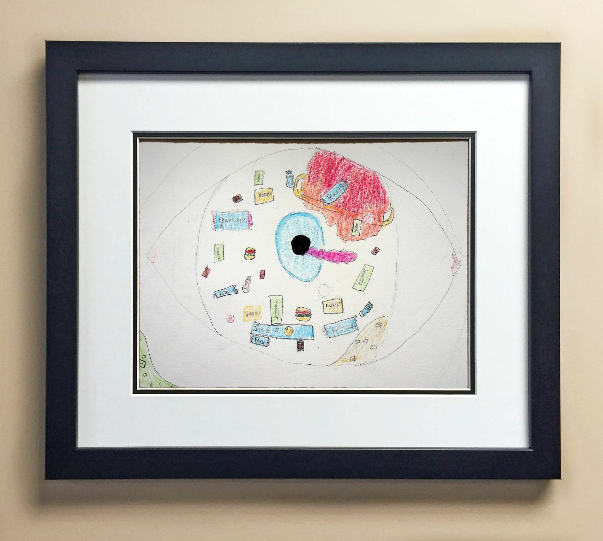 Included with the purchase is the Students Artwork, Frame, double matboard, shatter proof plexiglass, and a ready to hang backerboard with turnbuttons