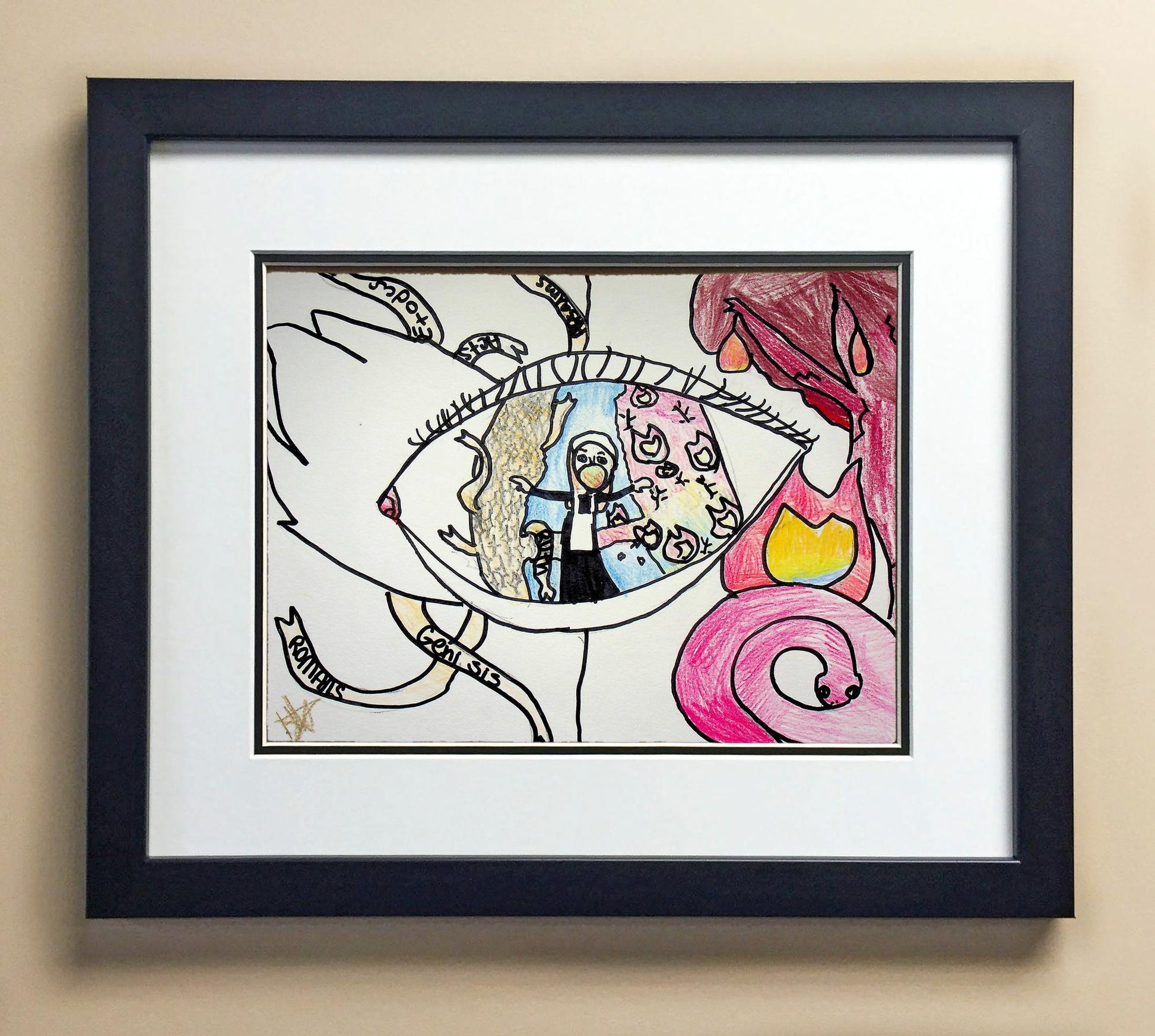 Included with the purchase is the Students Artwork, Frame, double matboard, shatter proof plexiglass, and a ready to hang backerboard with turnbuttons