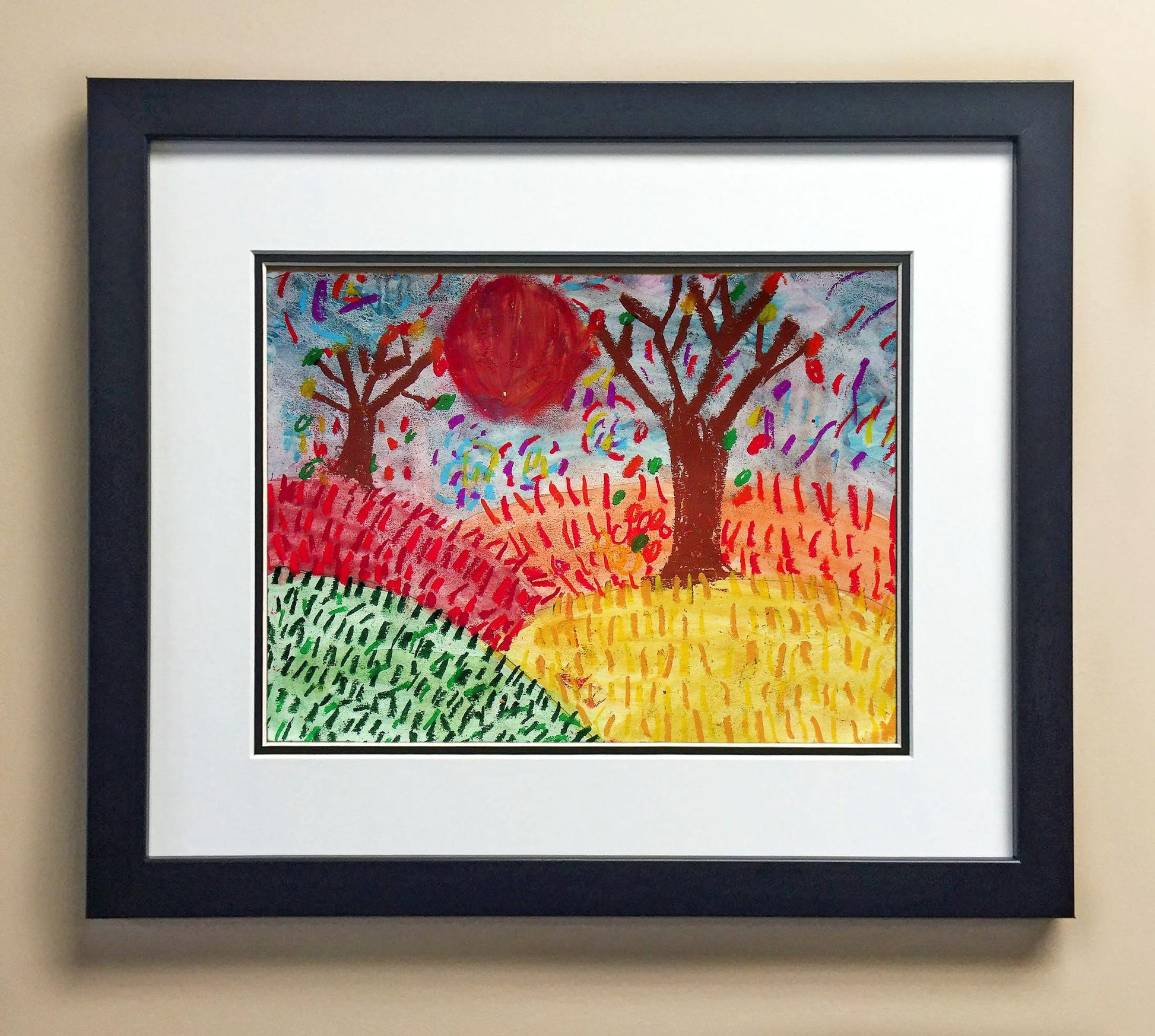 Included with the purchase is the Students Artwork, Frame, double matboard, shatter proof plexiglass, and a ready to hang backerboard with turnbuttons