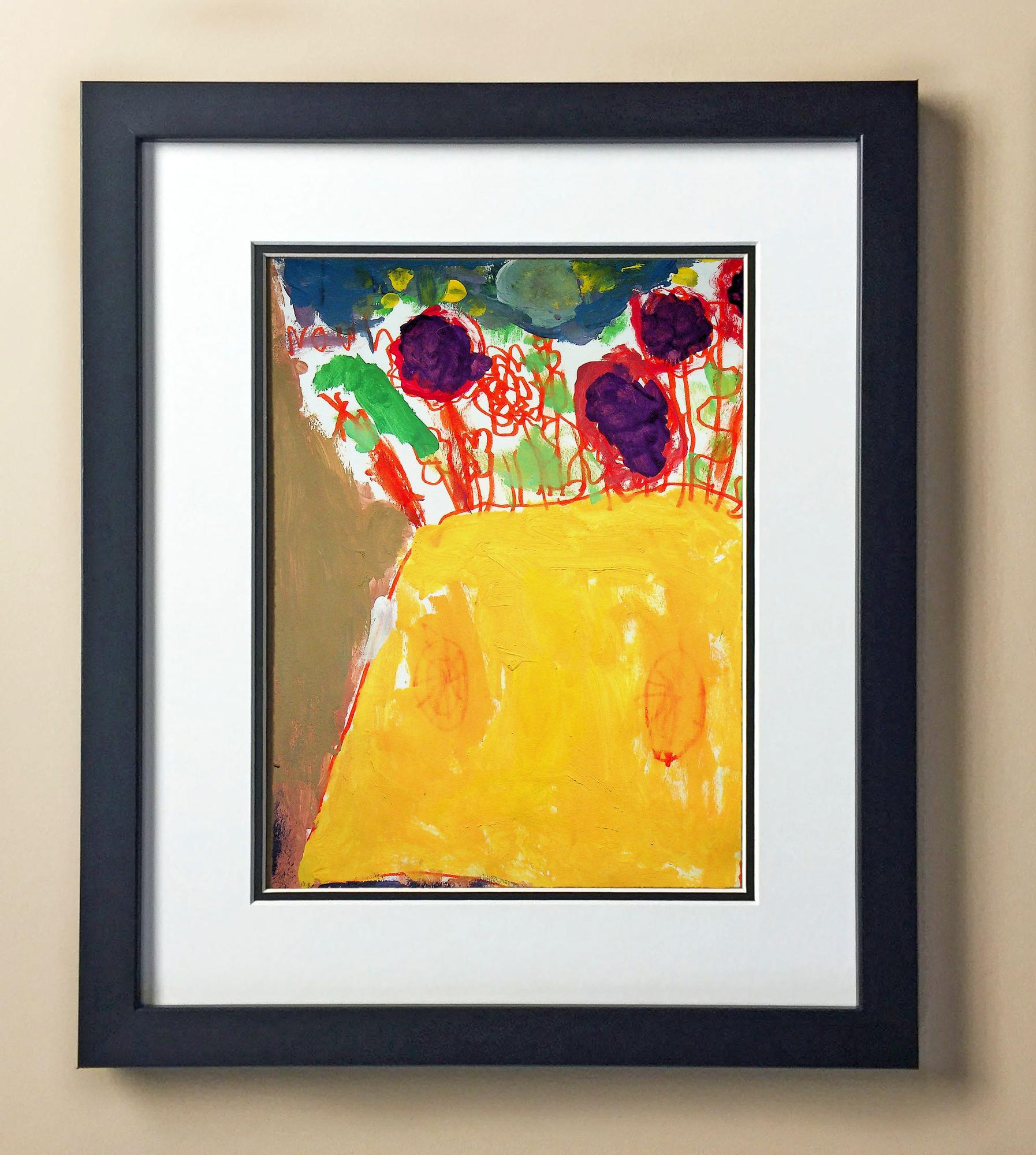 Included with the purchase is the Students Artwork, Frame, double matboard, shatter proof plexiglass, and a ready to hang backerboard with turnbuttons