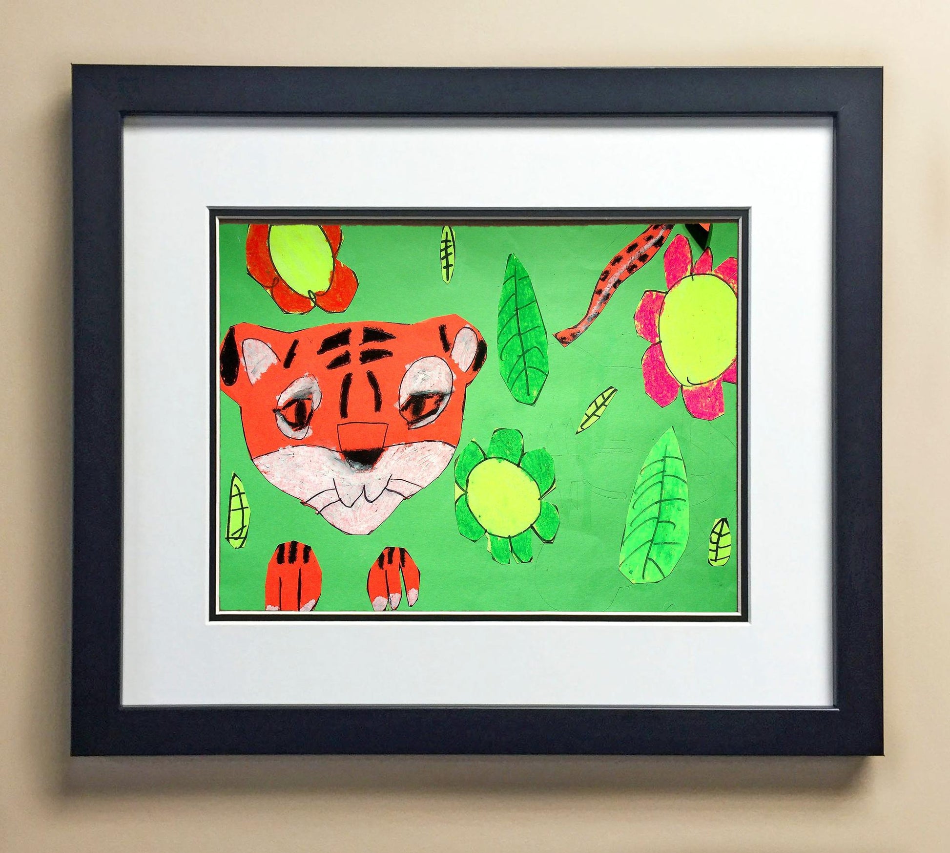 Included with the purchase is the Students Artwork, Frame, double matboard, shatter proof plexiglass, and a ready to hang backerboard with turnbuttons