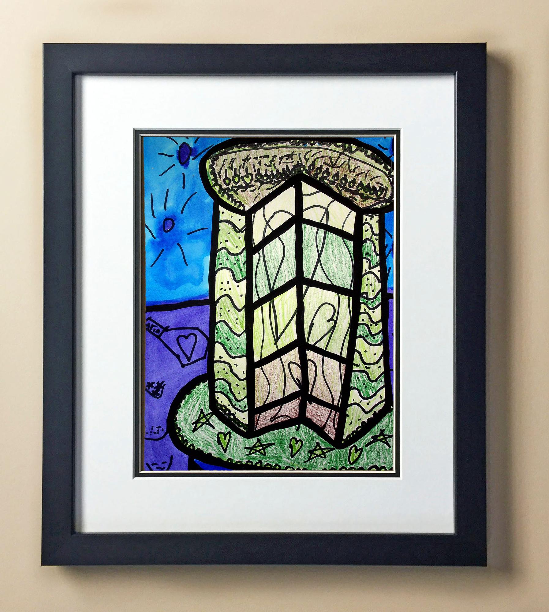 Included with the purchase is the Students Artwork, Frame, double matboard, shatter proof plexiglass, and a ready to hang backerboard with turnbuttons