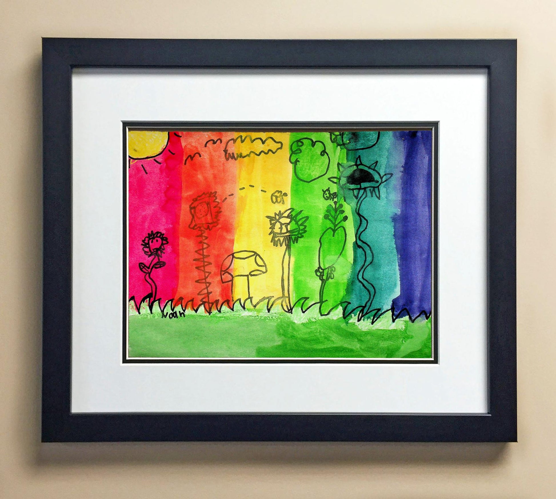 Included with the purchase is the Students Artwork, Frame, double matboard, shatter proof plexiglass, and a ready to hang backerboard with turnbuttons