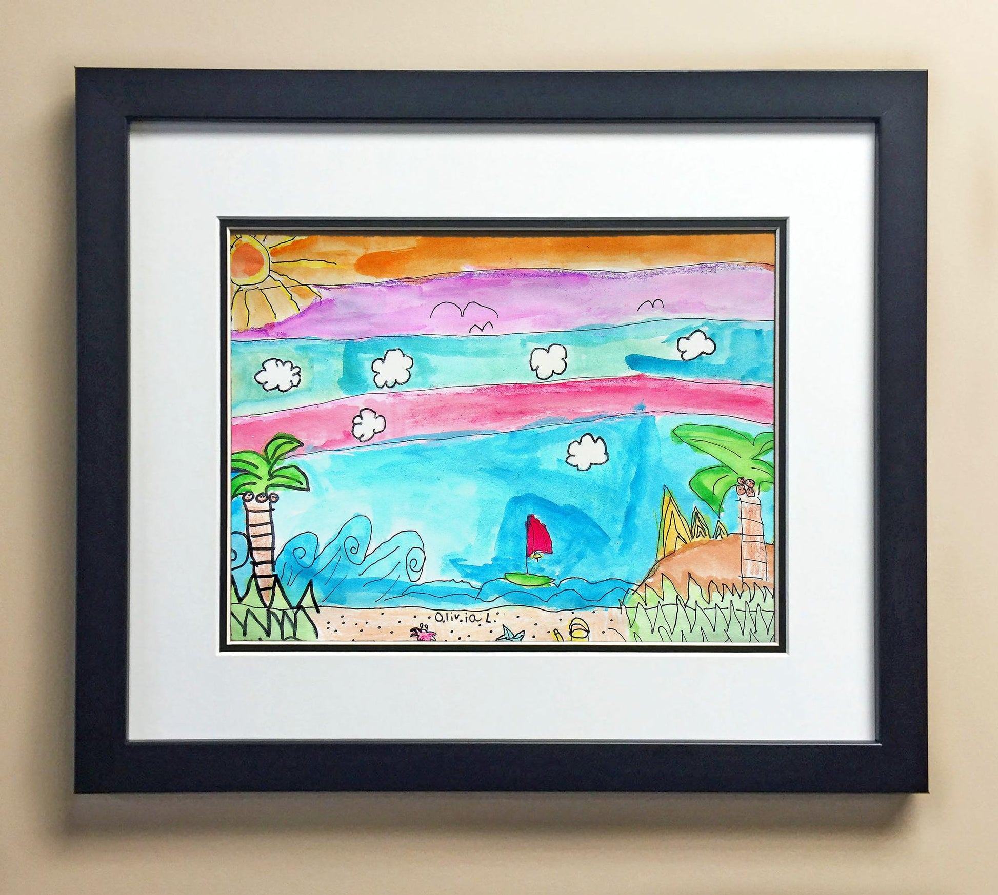 Included with the purchase is the Students Artwork, Frame, double matboard, shatter proof plexiglass, and a ready to hang backerboard with turnbuttons