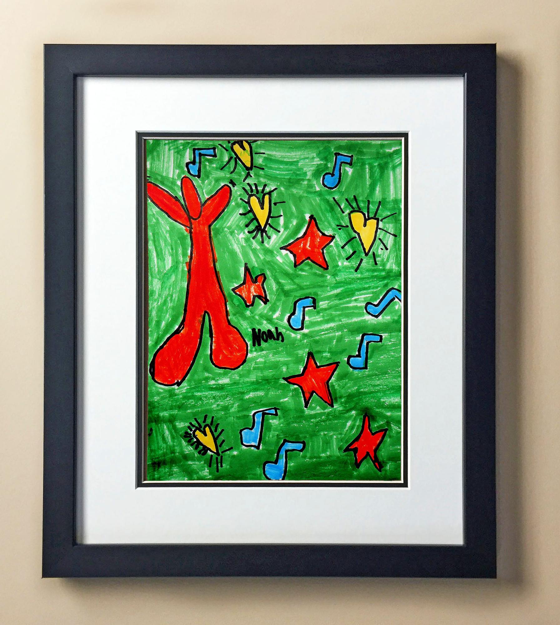 Included with the purchase is the Students Artwork, Frame, double matboard, shatter proof plexiglass, and a ready to hang backerboard with turnbuttons