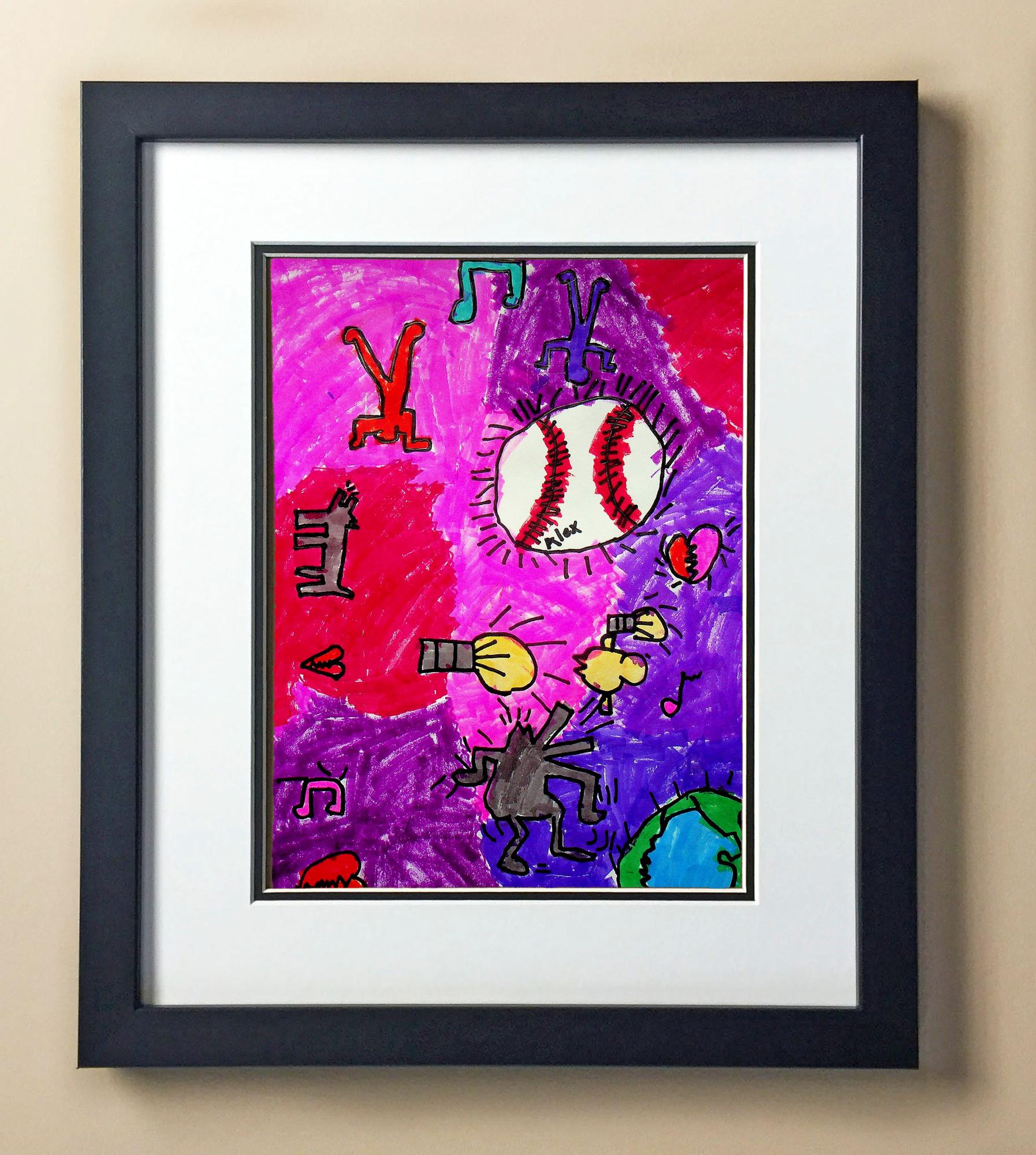 Included with the purchase is the Students Artwork, Frame, double matboard, shatter proof plexiglass, and a ready to hang backerboard with turnbuttons