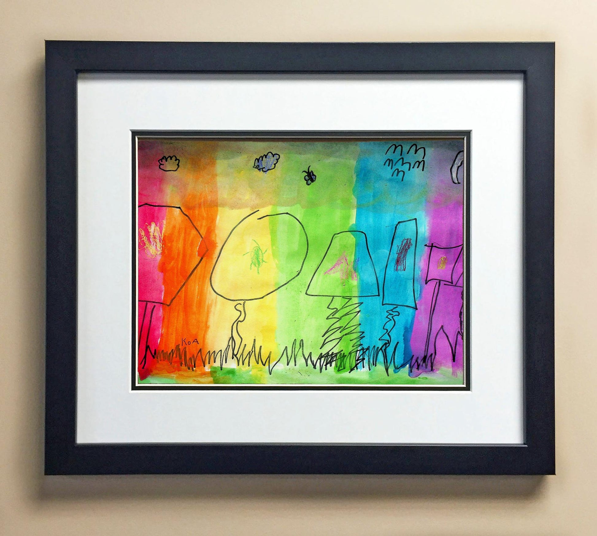 Included with the purchase is the Students Artwork, Frame, double matboard, shatter proof plexiglass, and a ready to hang backerboard with turnbuttons