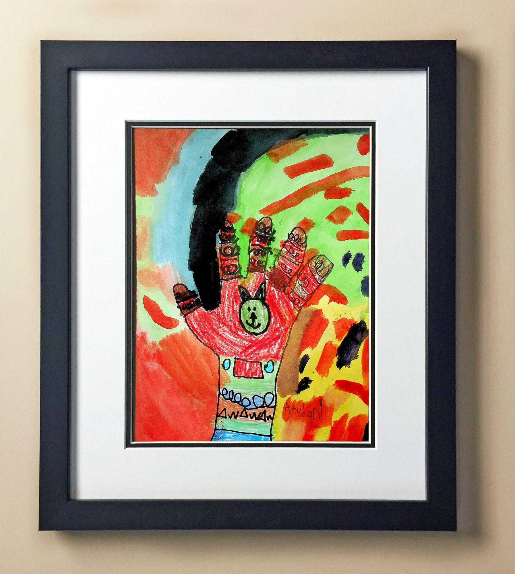 Included with the purchase is the Students Artwork, Frame, double matboard, shatter proof plexiglass, and a ready to hang backerboard with turnbuttons
