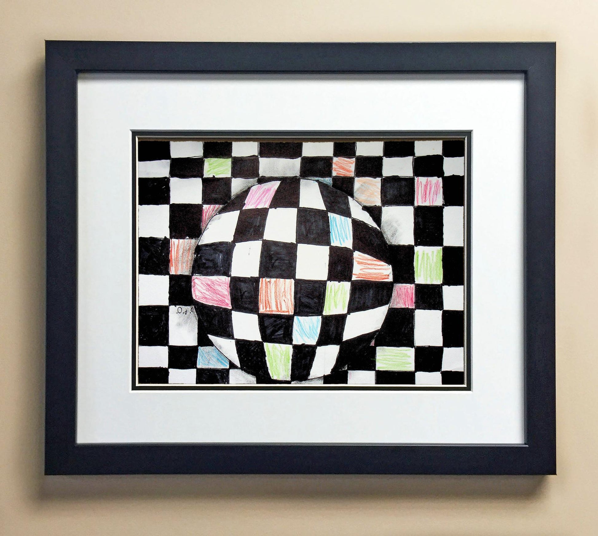 Included with the purchase is the Students Artwork, Frame, double matboard, shatter proof plexiglass, and a ready to hang backerboard with turnbuttons