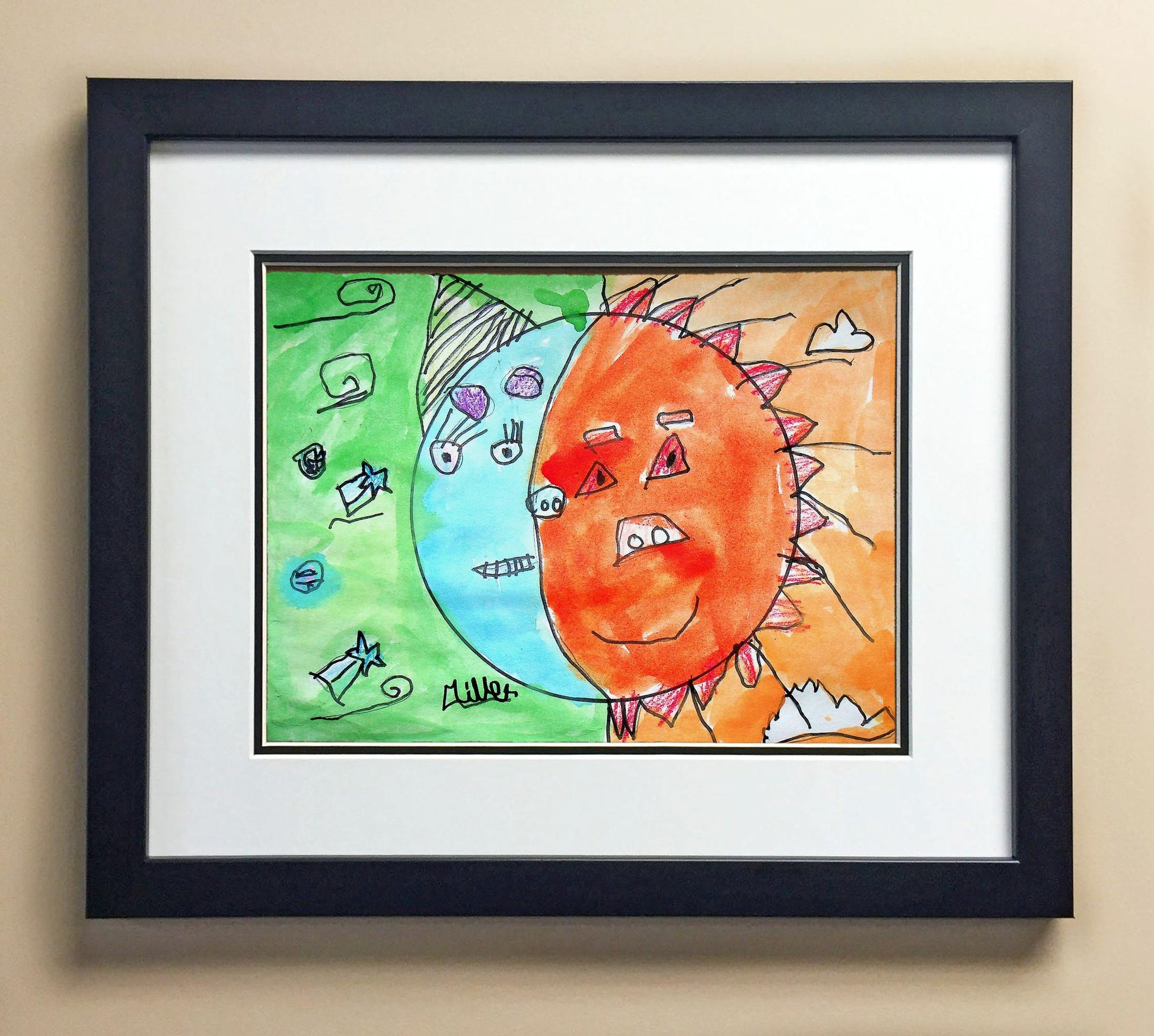 Included with the purchase is the Students Artwork, Frame, double matboard, shatter proof plexiglass, and a ready to hang backerboard with turnbuttons