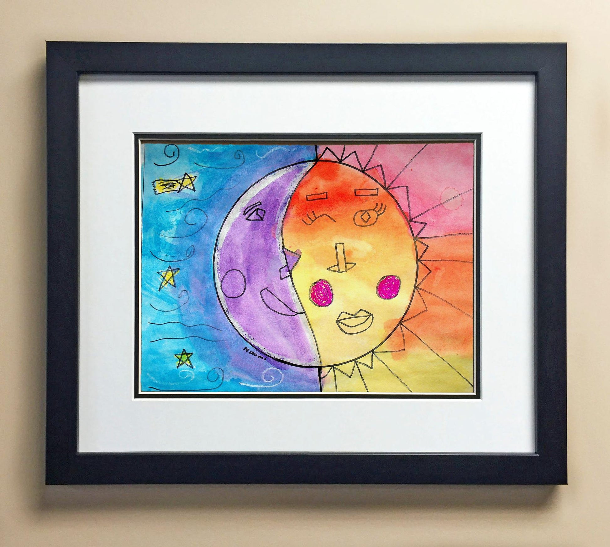 Included with the purchase is the Students Artwork, Frame, double matboard, shatter proof plexiglass, and a ready to hang backerboard with turnbuttons