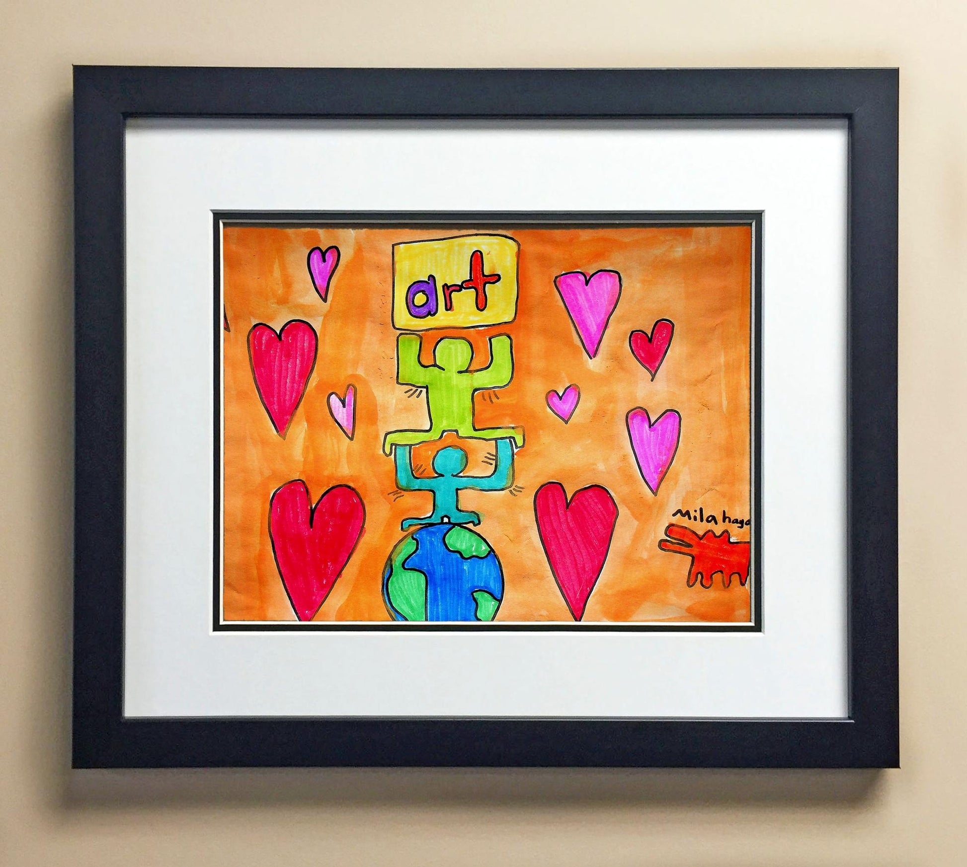Included with the purchase is the Students Artwork, Frame, double matboard, shatter proof plexiglass, and a ready to hang backerboard with turnbuttons